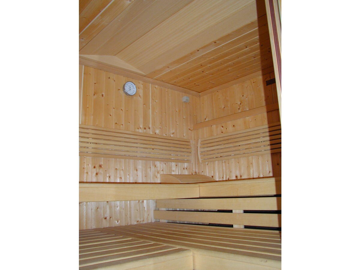 Die Küche ist ausgestattet mit Kühlschrank, Geschirrspülmaschine, E-Herd mit Ceranfeld und Backofen, dazu Mikrowelle mit Grill, Toaster und Kaffeemaschinen (u.a. JURA Impressa Z-Serie), etc. Kochbücher für gesunde Ernährung und Fitness-Anleitungsbücher sind ebenfalls in den Häusern vorhanden. Eine Waschmaschine, Wäschetrockner, zweiter Kühlschrank und Gefrierschrank stehen im Hauswirtschaftsraum zur Verfügung. Zerstreuung und Kommunikation ermöglichen vier Farb-TV mit digitaler SAT-Antenne und teilw. DVD / Blu-ray Player, alle HD-Fernsehgeräte haben USB-Anschlüsse, so dass sie auch als USB-Videorecorder genutz werden können (alle TV´s zwischen 22 und 40 Zoll aus der Grundig - Serie), Stereoanlage mit CD- Player; Bose SoundDock für iPhone und iPod, Philips DC291 für iPhone, iPod und iPad; internet-fähiger PC (eigener UMTS-Stick erforderlich) mit TV und Spielekonsolen - sowie Flat-rate-Telefon ins deutsche Festnetz. Die bis zu acht Gäste eines Hauses können sich auf vier Schlafräume verteilen. Es gibt je Haus ein Bad mit Doppelwaschtisch, Bidet, separater Dusche mit Whirlpool sowie ein Bad mit Sauna und Dusche; so dass insgesamt maximal 8 Personen pro Haus einen ruhigen und erholsamen Urlaub hier verbringen können (bei zeitgleicher Anmietung beider Ferienhäuser sogar maximal 16 Personen in unmittelbarer Nähe zu einander) und die Kinder und Erwachsene können sich daurüber hinaus in den Spiellandschaften des Gartens austoben!