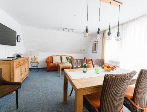 Unmittelbar am Fuße der Homert (656 Ü. Nn) in absolut ruhiger Südhanglage - direkt am Wald - liegt unser Appartmenthaus mit 2 separaten Wohnungen (Typ B - ebenerdig 60 qm mit direktem Zugang zur Liegewiese mit Kneipp-Tretbecken und einem Grillplatz mit Grillkamin und Typ G 70 qm in der 1. und 2. Etage gelegen und über eine Außentreppe zu erreichen mit eigener Terasse mit Grillkamin. Beide Appartments sind einzeln oder zusammen anzumieten. Jedes dieser App. hat 2 bzw. 3 Doppel-Schlafzimmer für 4 - 7 Personen (insgesamt für 11 Personen mit einem Zusatzbett) je 1 Küche, 1 Wohnzimmer mit Essecke - 1 bzw. 2 Du/WC, - 1 Terrasse mit Grillkamin und in Typ G zusätzlich noch eine Infrarotsauna (Saunatücher werden nicht gestellt).