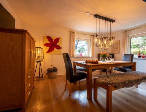 Erdgeschoss: Empfang, Esszimmer mit TV, Badezimmer (Badewanne, Dusche, Toilette, Waschbecken,Fön), Küche (Backofen, Geschirrspülmaschine, Mikrowelle), 1*Schlafzimmer (Doppelbett) 1*Badezimmer mit Dusche im Kellergeschoss Obergeschoss:1*Schlafzimmer 1*Doppelbett, 1* Schlafzimmer 2* Einzelbett, Wohnzimmer (Radio, Kabel-TV,DVD) Direkt nebenan ( ca. 8,00 m ): Nebenhaus: Ca. 45,0 qm Wohnfläche