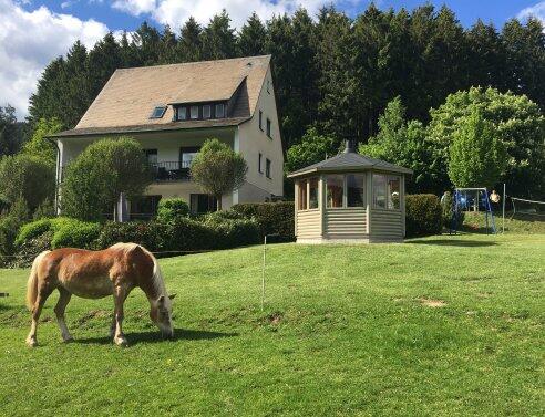 Ein Haus der Extraklasse, ausgestattet mit wertvollen Möbeln, echten Parkettböden, großzügigen Balkonen, Grillplätzen, Liegewiese, Sonnensitzplatz, Gartenlaube usw. Eröffnet wurde es zum 1. Juli 2011. Dieses Haus bietet sich als Nichtraucher-Gruppenhaus für 2 - 16 Personen an. Es ist kein Haustier gestattet. Die Größe des Objektes beträgt: 280. qm. Besonderheiten, die Ihnen dieses Haus und die Ferienhäuser Tillmann bieten: eigener Saunabereich, kostenlose W-LAN-Nutzung, Wellnessmassagen, Kneipp-Tretbecken, Kräutergarten, kostenlose hauseigene Fahrräder (davon ein E-Bike gegen Nutzungsgebühr), Spielplätze mit Schaukeln und Trampolin, Badmintonplatz, Außentischtennis, Kleintiere, Spielhaus mit Kicker usw.. Auf einem ca. 5000 m² großen Grundstück mit einem kleinen Bach und Kneipp-Tretbecken liegen unsere im Familienbetrieb geführten Ferienhäuser direkt am Wald in sehr ruhiger Südhanglage umgeben von Wäldern und Wiesen mit gepflegten Anlagen (keine Durchgangsstraße).