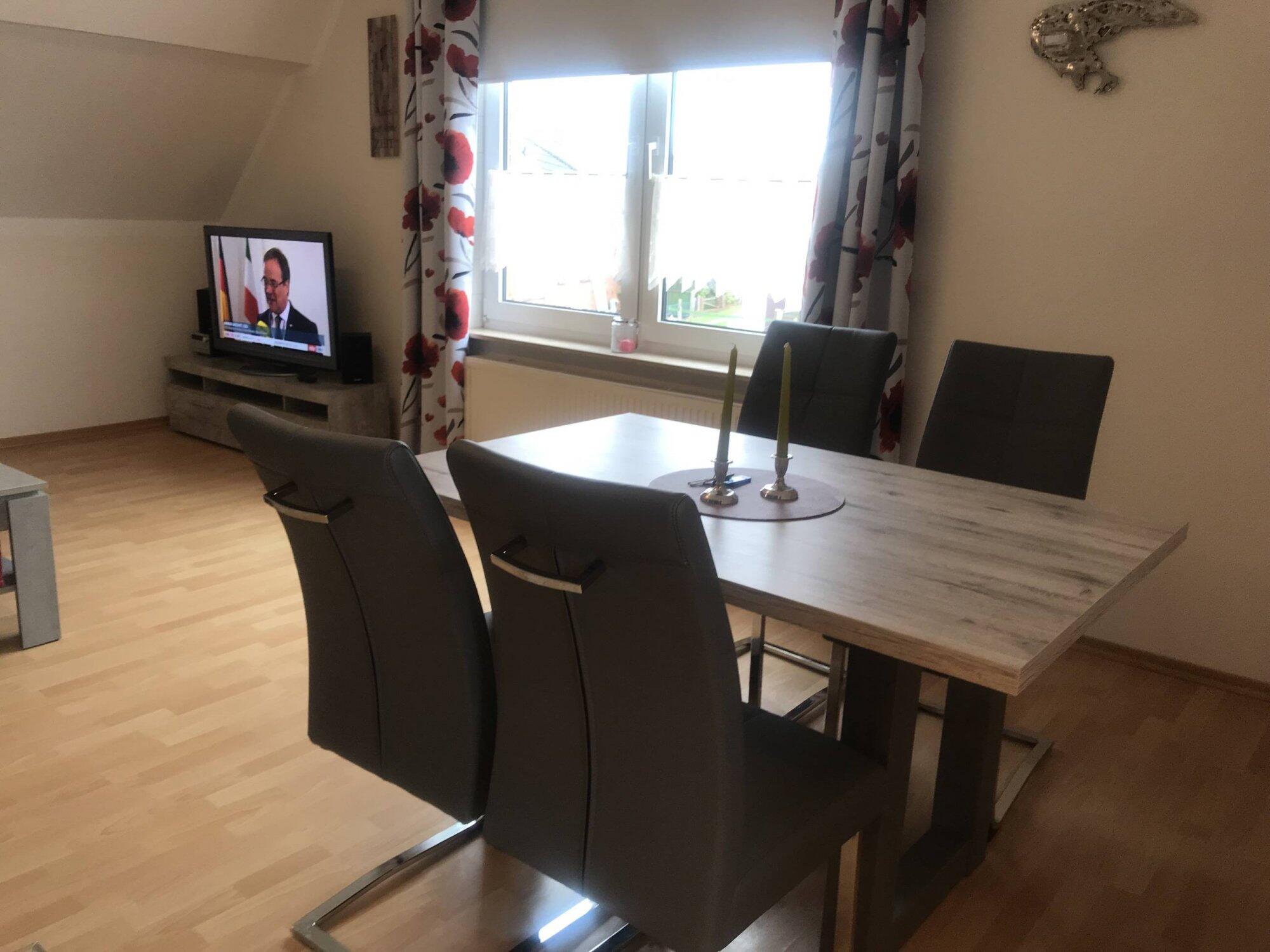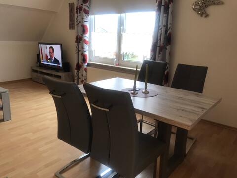 Unsere Ferienwohnung befindet sich im ersten Obergeschoss und ist für bis zu 6 Personen konzepiert. Sie besteht aus einem Schlafzimmer mit Doppelbett, einem mit zwei Einzelbetten. Ein Duschbad und einem Wohn-Küchenbereich vervollständigen die Wohnung. Ein Fahrradständer befindet sich am Haus.