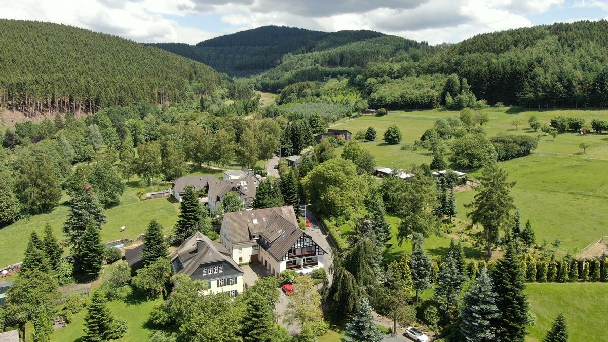 Unser Ferienhaus liegt in ruhiger und idyllischer Lage am Ortsrand vom Kurort Oberhundem in unmittelbarer Nähe des Kurparks. Direkt vor dem Haus beginnt ein Rothaarsteig-Zuweg. Auf der zum Haus gehörenden Liegewiese befinden sich Sonnenliegen, Sitzgruppen und eine Grillmöglichkeit. Für Kinder stehen Schaukel, Sandkasten und Tischtennisplatte bereit. Auf dem Ferienhof befinden sich verschiedene Tiere, wie Gänse, Hühner und der Cocker-Spaniel Lena. Am eigenen Forellenteich gibt es Gelegenheit zum Angeln. Für die Fitness bieten wir im Haus eine Sauna und Fitnessgeräte an. Ein Waschraum mit Waschmaschine und Trockner ist ebenfalls vorhanden.