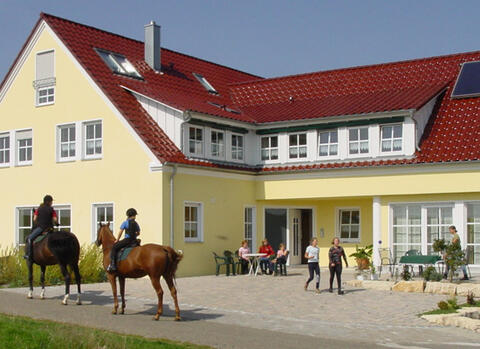 Sie erfahren hier einiges Wissenswerte über uns, unsere Pferde, das Reiten, sowie das Urlaub machen auf unserem Härtsfeldhof. Sie kennen uns schon? Dann sind Sie vielleicht an aktuellen News interessiert! Wenn Sie mehr über uns erfahren möchten und dazu sich einen kleinen Film anschauen möchten dann gehen Sie auf unsere Aktuelle Seite. Auch mit Hund sind Sie bei uns jederzeit herzlich willkommen. Ob Sie das Reiten an der Longe beginnen, Dressur- bzw. Springreiten erlernen oder verbessern wollen, das Kleine Hufeisen, den Reiterpass, eine Reitabzeichenprüfung anstreben oder einen Tagesausritt in unserer herrlichen und für das Ausreiten wie geschaffenen Landschaft (weit über 2000 km Wege in Tagesrittentfernung) unternehmen möchten, hier finden Sie Ihren treuen Gefährten, dem Sie vertrauen werden. Vom kleinsten Pony bis zum ausgewachsenen Warmblut finden Sie alle Größen und Ausbildungsstände. Die Art gerechte Haltung unserer Pferde in hellen, geräumigen Boxen sowie die behutsame Ausbildung zum vertrauensvollen Partner des Menschen, regelmäßiges Korrekturreiten und Koppelgang in großen Herden gehören zur Selbstverständlichkeit für uns. Auf der Reitanlage gibt es keine Einkaufsmöglichkeiten - im Ort (2 km entfernt) finden Sie alle Geschäfte und Supermärkte. Frische Frühstücksbrötchen können Sie bestellen und täglich im Gästehaus abholen. Ansonsten können Sie (kurzfristige Voranmeldung genügt) an allen Mahlzeiten im Gästehaus teilnehmen.