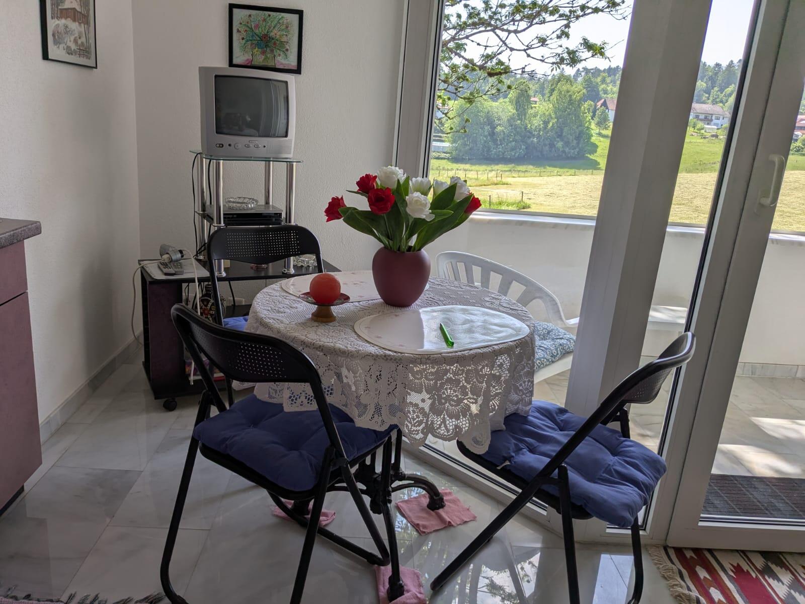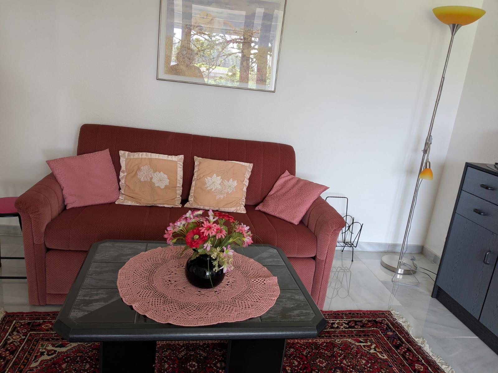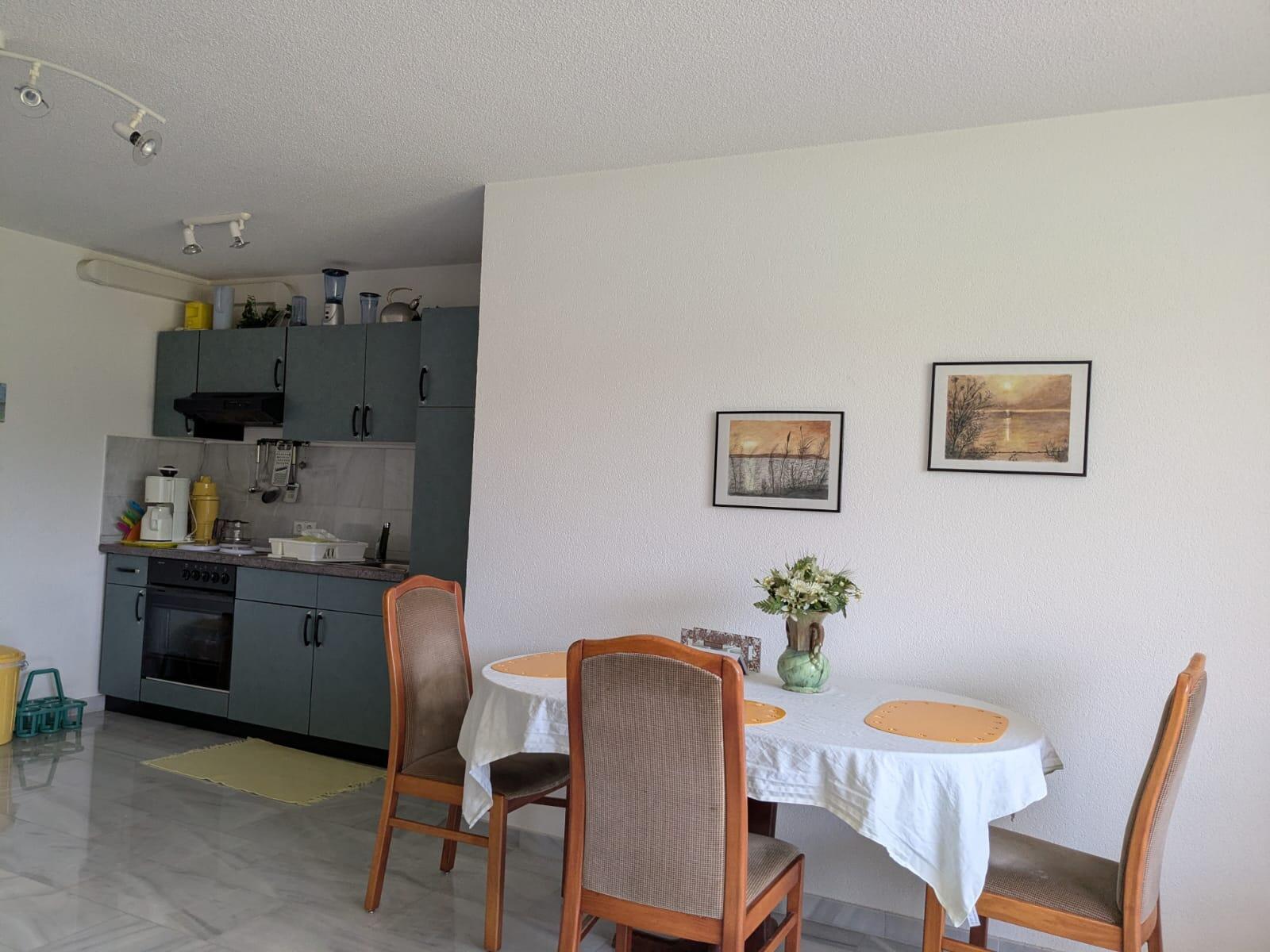 Das Wohnzimmer bietet eine gemütliche Atmosphäre mit Sitzgruppe (Couch ausziehbar), Esstisch, Einbauküche (komplett ausgestattet) und SAT-Fernsehen, sep. Schlafzimmer und Dusche/WC;