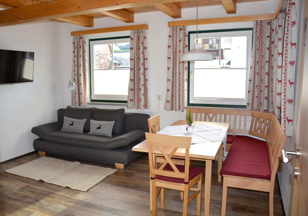 Das Appartement (ca. 60m²) besteht aus 2 Doppelbettzimmern mit je einem Zusatzbett für 4-6 Personen, Balkon, 1 Badezimmer, WC, Haarfön, 3x Fernseher, WIFI, Wohnküche komplett ausgestattet mit Geschirr, Geschirrspüler, Mikrowelle mit Grillfunktion, Wasserkocher, Tassimo Kaffeemaschine, Ceranfeld (2 Kochplatten); Bettwäsche und Handtücher sind vorhanden. Unser neues Appartement (ca. 60m²) wurde komplett renoviert (2018) und besteht aus 2 Doppelbettzimmern mit je einem Zusatzbett für 4-6 Personen, Balkon, 1 Badezimmer, WC, Haarfön, 3x Fernseher, WIFI, Wohnküche komplett ausgestattet mit Geschirr, Kühlschrank mit Gefrierfach, Tassimo Kaffeemaschine, Wasserkocher, Toaster, Geschirrspüler, Mikrowelle, Ceranfeld, Backofen, Couch (ausziehbar), Bettwäsche und Handtücher sind vorhanden. Außerdem bieten wir einen beheizten Schuhraum sowie einen Schistall.