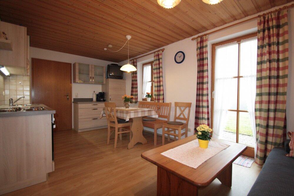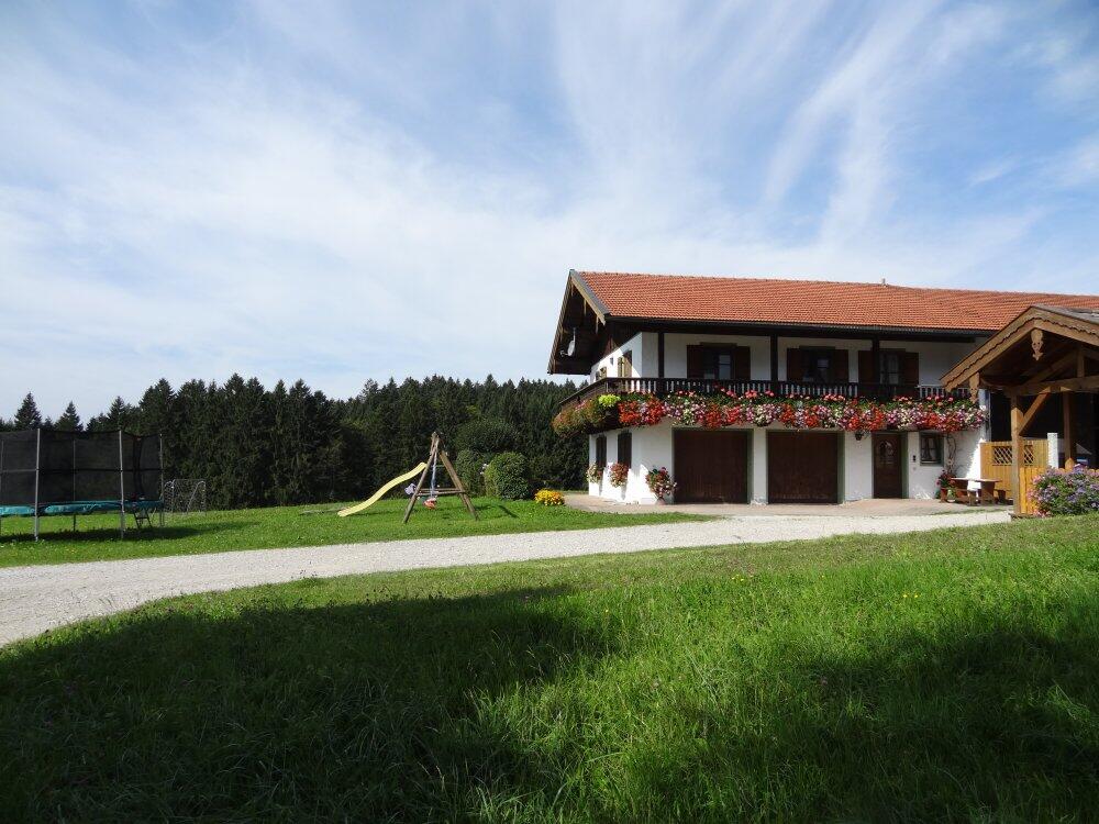Ihr Feriendomizil befindet sich im Nebenhaus des Hofanwesens. Es beträgt ca. 55 m² und kann bis zu 4 - 5 Personen beherbergen. Eine Liegewiese, Spielplatz mit Spielgeräten, Tischtennis gehören selbstverständlich dazu. Die Tobi Angerer Langlaufloipe befindet sich direkt am Haus. Die Ferienwohnung befindet sich im EG, eigener Eingang, eigene Terrasse, zwei Schlafzimmer mit Doppelbett, eine Wohnküche. Eine komplett ausgestattete Küchenzeile mit Spülmaschine, Kaffeemaschine, Toaster, eine Essecke, Sat-TV, sowie Dusche/WC.