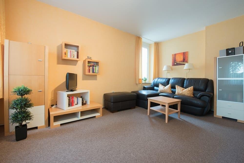 Die Wohnung "Atelier" im EG ist ca. 73 qm groß und für max. 2 Personen und einem Schlafzimmer mit Doppelbett, oder ca. 92 qm mit zweitem Schlafzimmer mit drei Einzelbetten für max. 5 Personen ausgestattet.