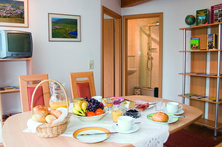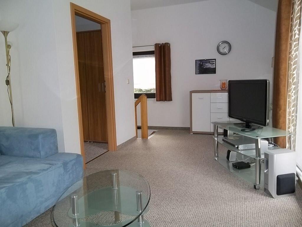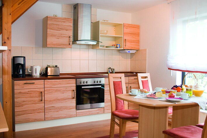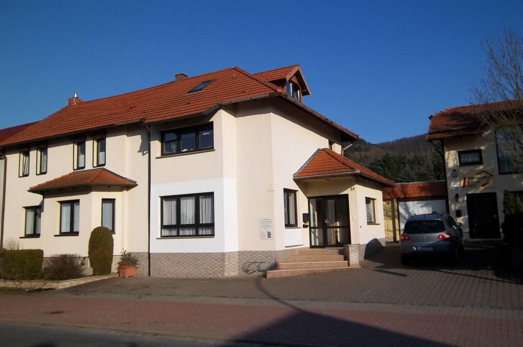 Große helle Wohnküche mit Essplatz Kaffeemaschine, Toaster, Wasserkocher Elektroherd mit Dunstabzugshaube Radio Bad mit Dusche und WC Hauswirtschaftsraum mit Waschmaschine Wohnzimmer mit Panoramafenster und Blick zur Hainleite Gemütliche Sofaecke mit Sat-TV Schlafzimmer 2. WC im Obergeschoss Unsere Ferienwohnung ist 2013 neu renoviert und hochwertig ausgestattet. Internet ist auf Anfrage per WLAN verfügbar. Wir sind sicher Sie geniessen Ihren Aufenthalt. Gemütliche Sofaecke mit Sat-TV große helle Wohnküche Küchenzeile mit Kühlschrank und Backofen Kaffeemaschine, Toaster, Wasserkocher 1. Schlafzimmer mit Doppelbett ( auf Wunsch auch einzeln stehend ) 2. Schlafzimmer mit 1 Polsterliege und 1 Schlafcouch ( ausziehbar ) Kinderbett auf Anfrage