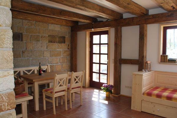 ***** Wohnung im Erdgeschoß, 2 bis 4 Personen Der besondere Charakter dieser Wohnung wird geprägt,durch die urigen Sandsteinwände, kombiniert mit uralten Holzbalken. Die Wohnküche ist für Sie in einen Koch- und Essbereich, sowie in einen gemütlichen Wohnbereich unterteilt. Küchenausstattung: Geschirrspüler,Herd mit Cerankochfeld und Backofen,Kühlschrank,Microwelle,Kaffeemaschine,Toster,Wasserkocher Am großen, massiven Holzesstisch finden Sie ausreichend Platz. Für wohlige Wärme und Gemütlichkeit sorgt eine Sitzecke mit Kamin und TV. Über die Terrassentür gelangen Sie von der Küche aus direkt zur Sandsteinterrasse. 5 ***** Wohnung im Dachgeschoß, für 2 bis 6 Personen Diese Wohnung ist für Sie mit zwei Schlafzimmern mit je einem Doppelbett, sowie mit einem dritten kleinen Schlafzimmer mit zwei Aufbettungen (Doppelstockbett) versehen. Die Betten sorgen mit ihren sorgfätig ausgewählten Matratzen und Lattenrosten und den üppigen Bettdecken für ein kuscheliges Schlafgefühl. So hoffen wir, dass auch Gäste mit Rückenproblemen bei uns einen erholsamen Schlaf finden. Große Menschen werden sich über die übergroßen Bettdecken freuen. Ein schönes, hell einladendes, großes Bad sorgt jederzeit für Ihr Wohlgefühl. Schon beim Duschen haben Sie einen Panoramablick zum Lilienstein. Eine zweite Toilette ist selbstverständlich vorhanden. Die Wohnküche ist für Sie in einen Koch- und Essbereich, sowie in einen gemütlichen Wohnbereich unterteilt. Küchenausstattung: Geschirrspüler,Herd mit Cerankochfeld und Backofen,Kühlschrank,Microwelle,Kaffeemaschine,Toster,Wasserkocher Am großen, massiven Holzesstisch finden 6 Personen ausreichend Platz. Für wohlige Wärme und Gemütlichkeit sorgt eine Sitzecke mit Kamin und TV.
