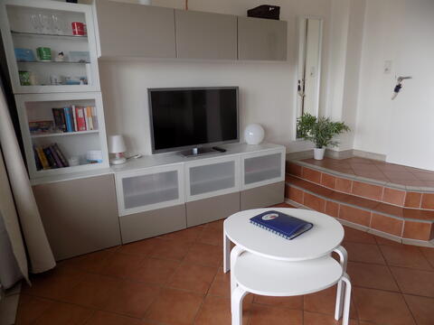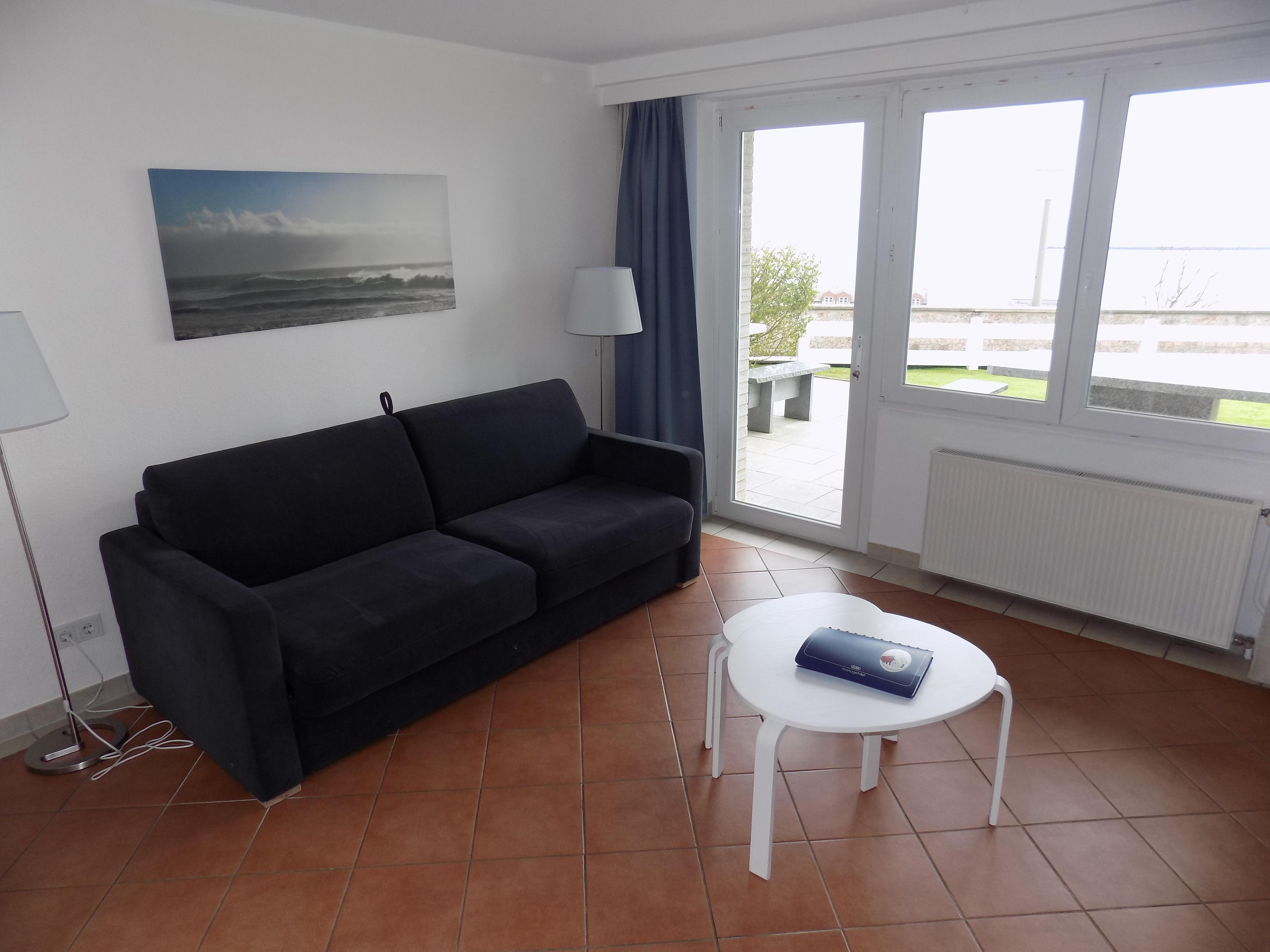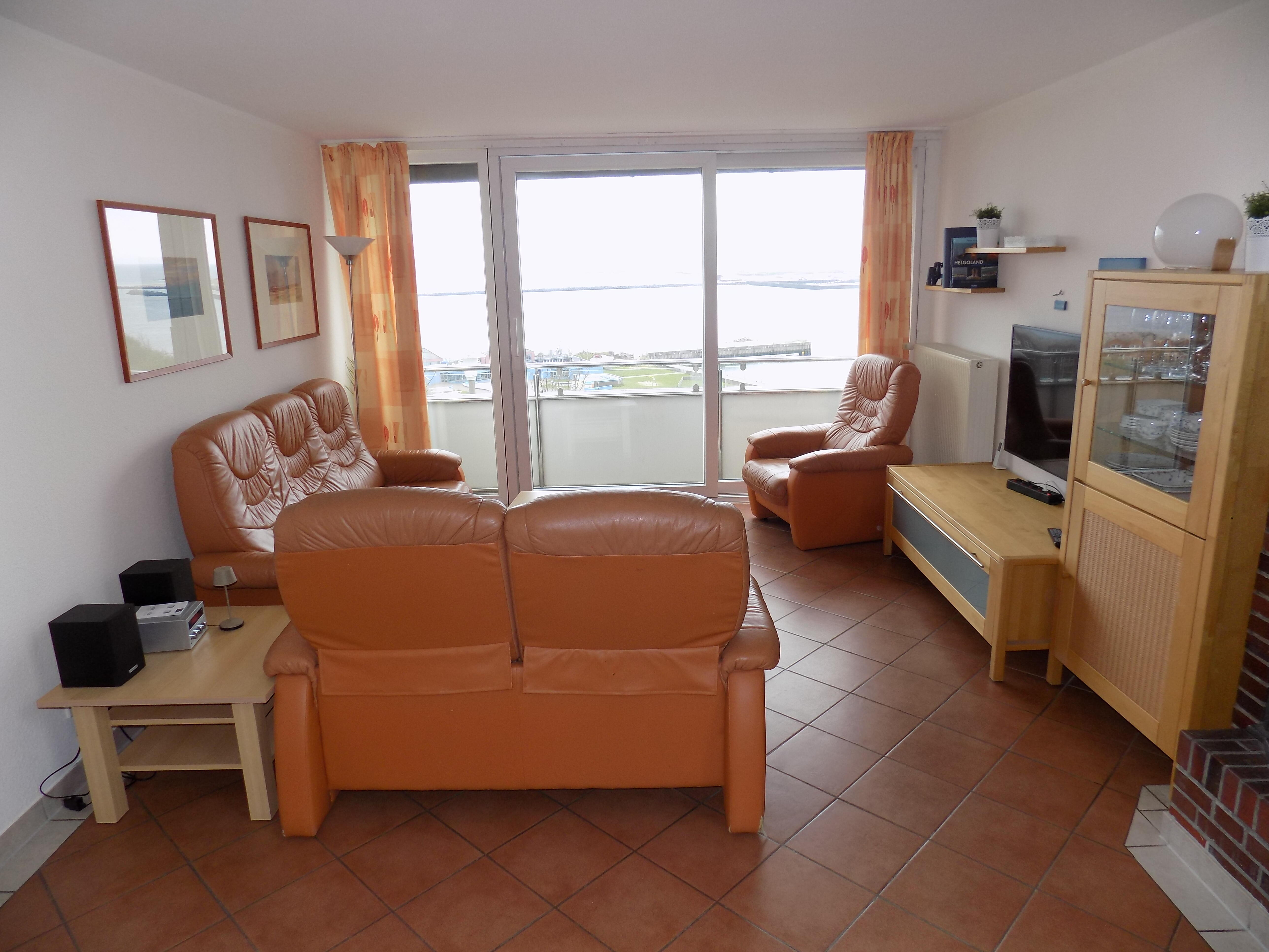 • offener Wohnbereich ausgestattet mit Ledersofa, TV, Sideboard