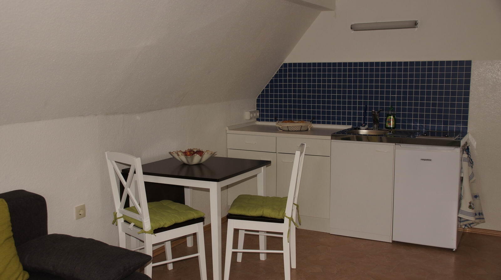 Nichtraucher-Ferienwohnung mit 45 qm Ausstattung SAT, TV, Radio HotSpot / WLAN / Internetzugang Wohn- / Esszimmer Pantryküche mit Mikrowelle, Kaffeemaschine, Wasserkocher, Eierkocher und Toaster Schlafzimmer für zwei Personen Dusche, Fön, Kosmetikspiegel Seperates WC Freisitz im Grünen mit Grillmöglichkeit Autoabstellplatz am Haus Abschließbarer Abstellraum für Fahrräder
