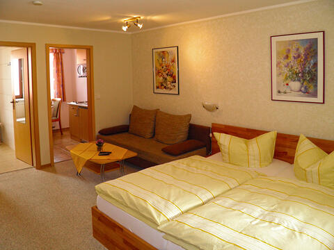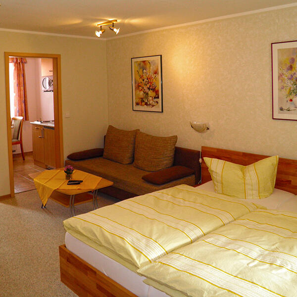3- Sterne-Komfort zum Wohlfühlen Unsere 3-Sterne-Pension bietet Ihnen 4 komfortable Nichtraucher-Doppelzimmer und Appartements für 12 Personen (Aufbettung auf Anfrage). Alle Zimmer sind mit neuen, modernen Bädern, TV, und Küche ausgestattet. Der weitläufige Garten lädt zur Entspannung ein. Sollte die Sonne einmal nicht scheinen, nehmen Sie einfach auf unserer überdachten Gästeterrasse Platz.