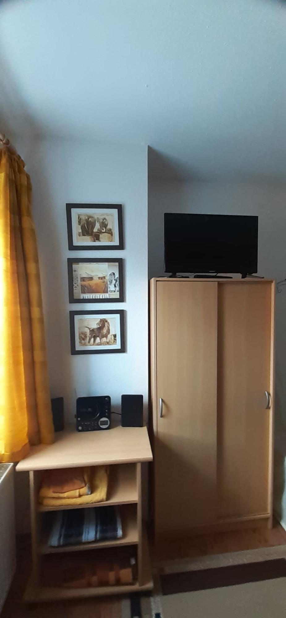 Die Fewo besteht aus 1 Schlafzimmer (mit Doppelbett, 2 Nachttische, Kleiderschrank, 2 Stühle, Radio, Fernseher), 1 Wohnzimmer (mit Schlafbett, Anrichten, Couch, Tisch, 2 Stühle, Radio, Fernseher), Bad (mit Wanne, Badmöbel, Fön), Küche (mit Kühlschrank, Geschirrspüler, Heißluft-Mikrowelle, 4 Kochplatten) Flur (mit Flurgarderobe).