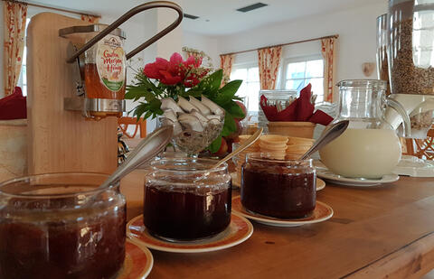 Auf unserer Sonnenterasse sowie in unserem hellen freundlichen Frühstücksraum beginnen Sie gemütlich Ihren Urlaubstag, mit einem köstlichen Frühstück, das keine Wünsche offen lässt! Von frischen Früchten und Säften über Eierspeisen bis hin zu selbst gekochten Marmeladen und anderen süßen und herzhaften Leckereien.