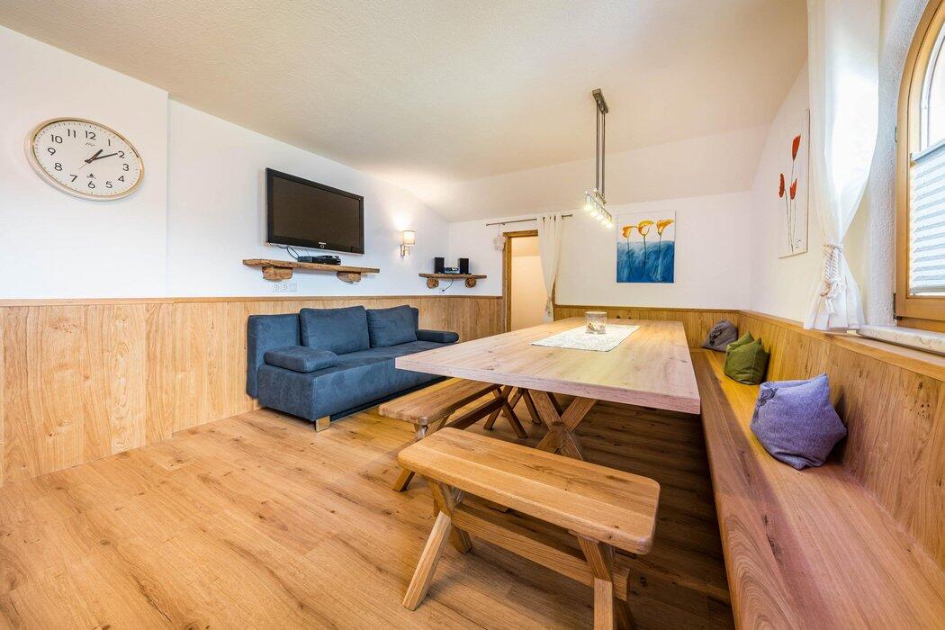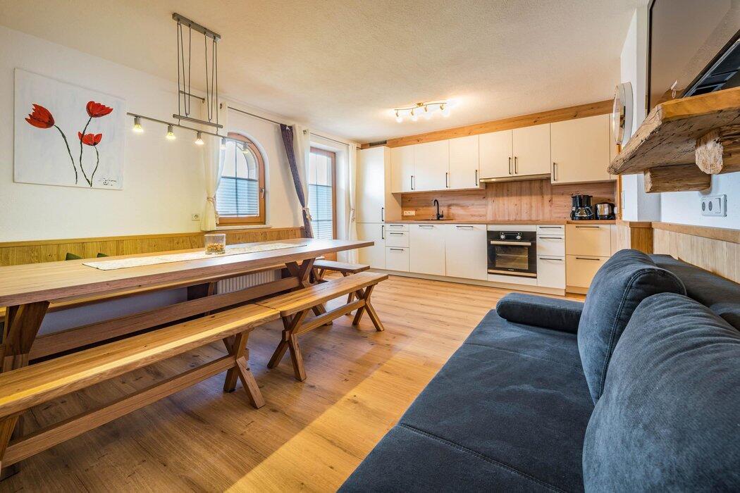 Es besteht die Möglichkeit, dass alle Personen in der großen Wohnküche im Apartment Sonnenschein gemütlich zusammen sitzen und essen können!