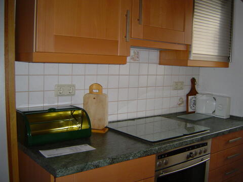 Küche mit Cerankochherd, Mikrowelle, Kühl-Gefrierkombination, Geschirrspüler, Kaffeemaschine, Wasserkocher, Toaster