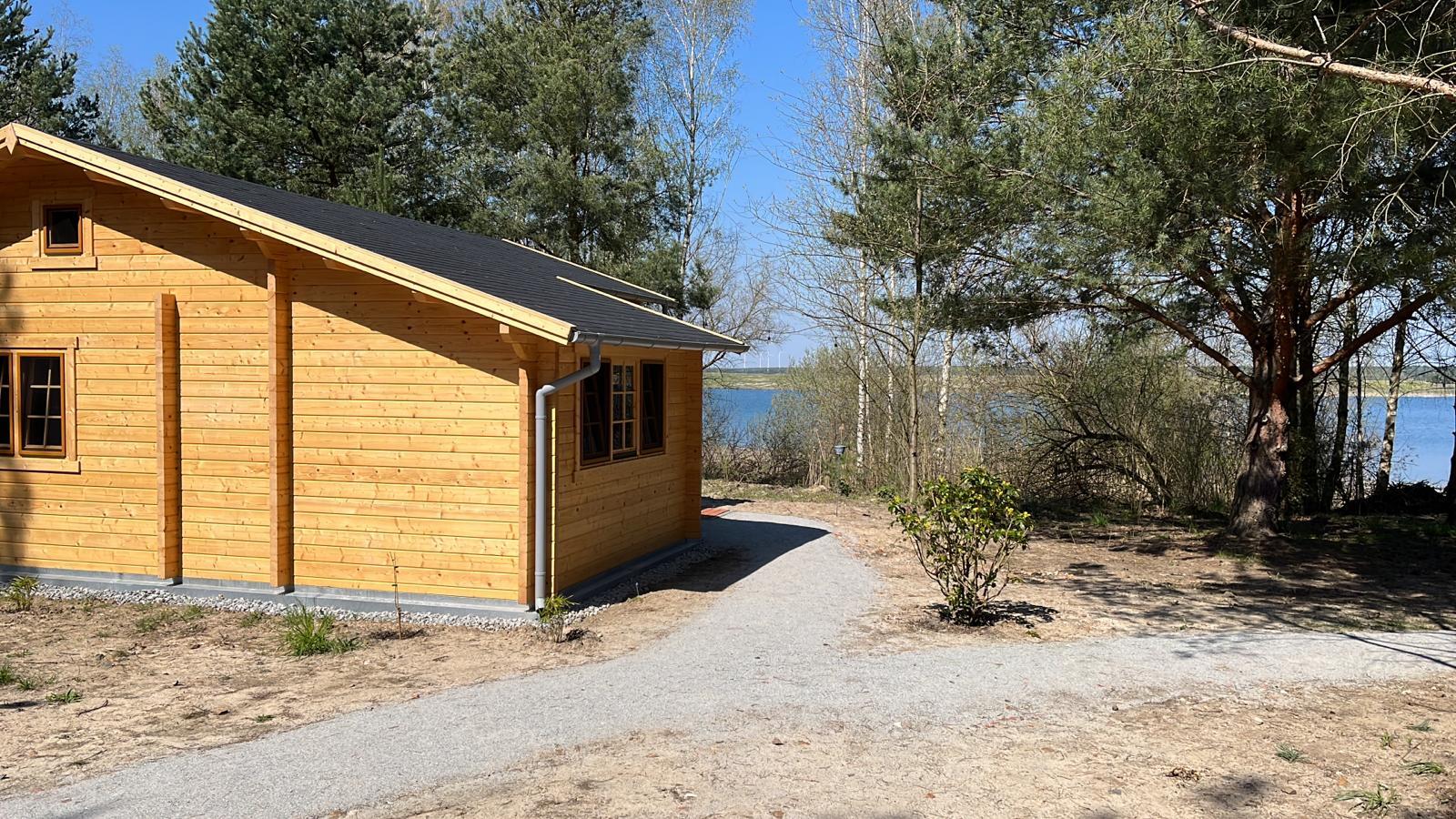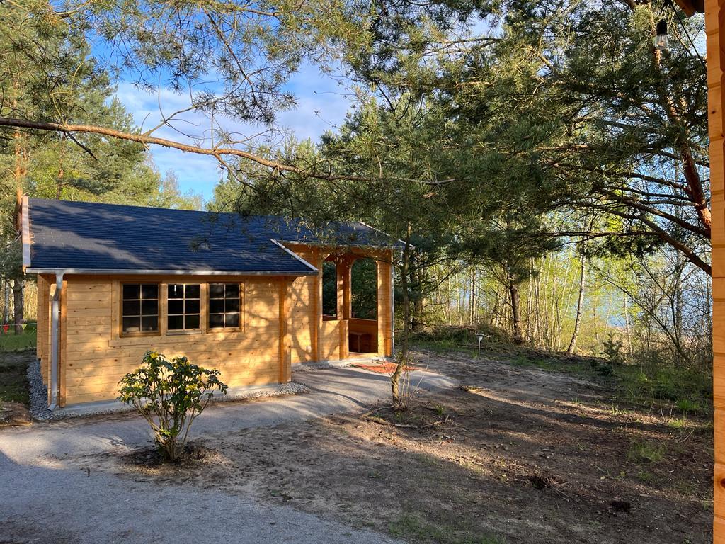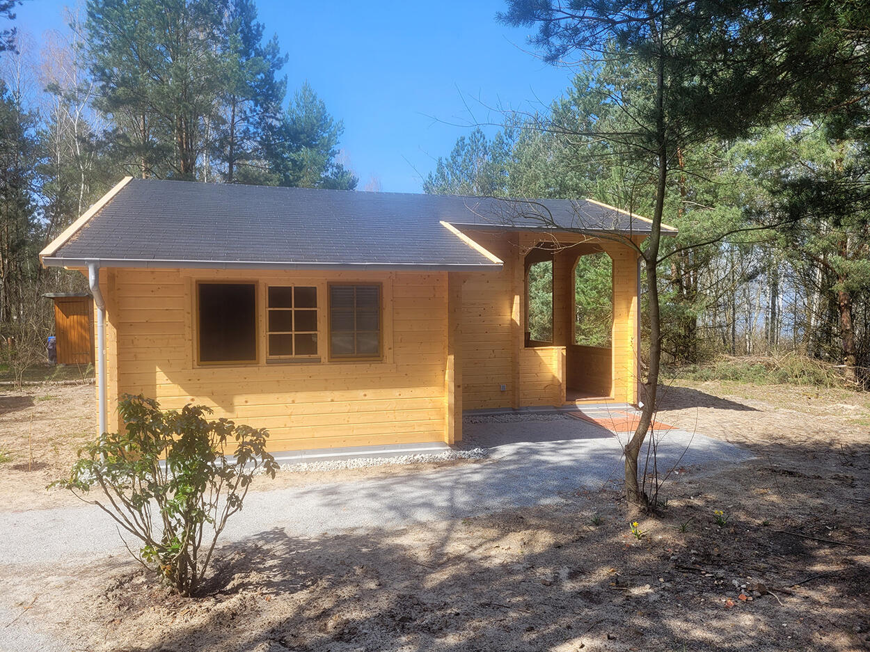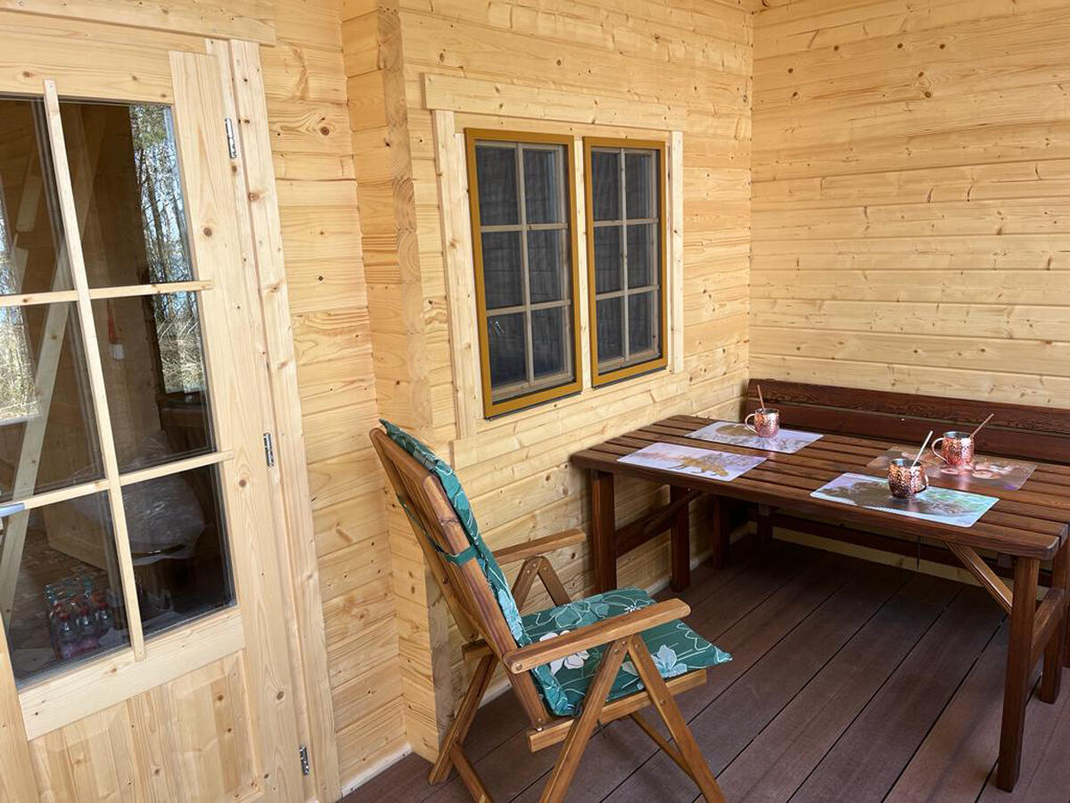Das Ferienhaus besteht aus Blockbohlen (70mm) mit einem Schlafboden und verfügt über eine einladende wettergeschützte Terrasse. Die Grundfläche beträgt circa 40 m².