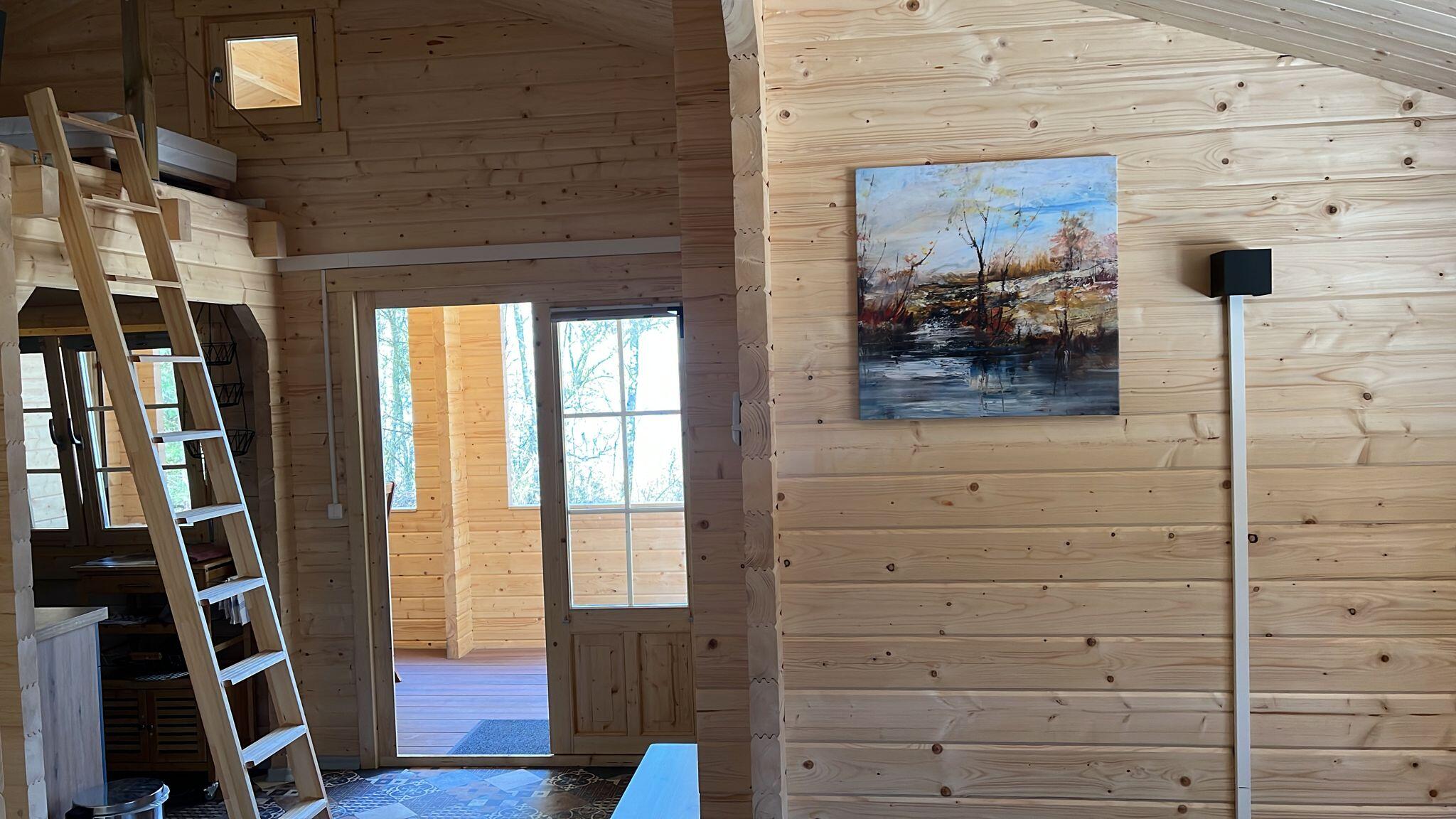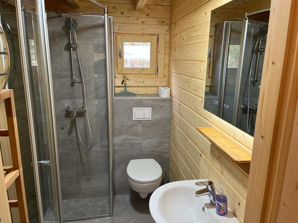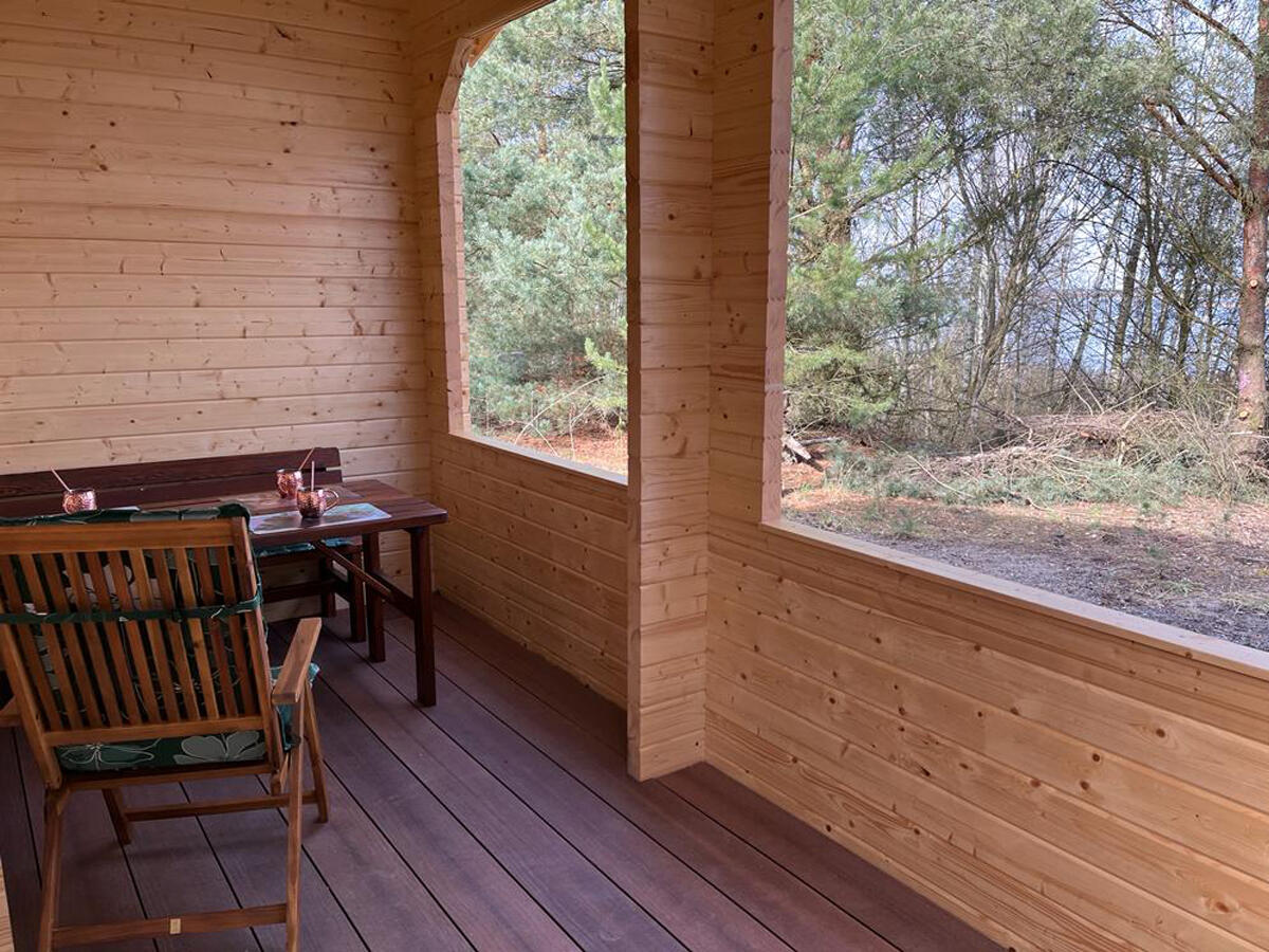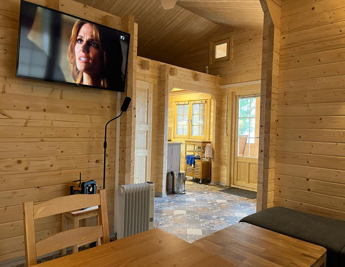 Das Ferienhaus besteht aus Blockbohlen (70mm) mit einem Schlafboden und verfügt über eine einladende wettergeschützte Terrasse. Die Grundfläche beträgt circa 40 m².