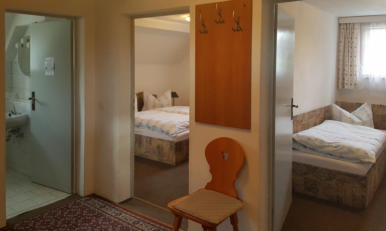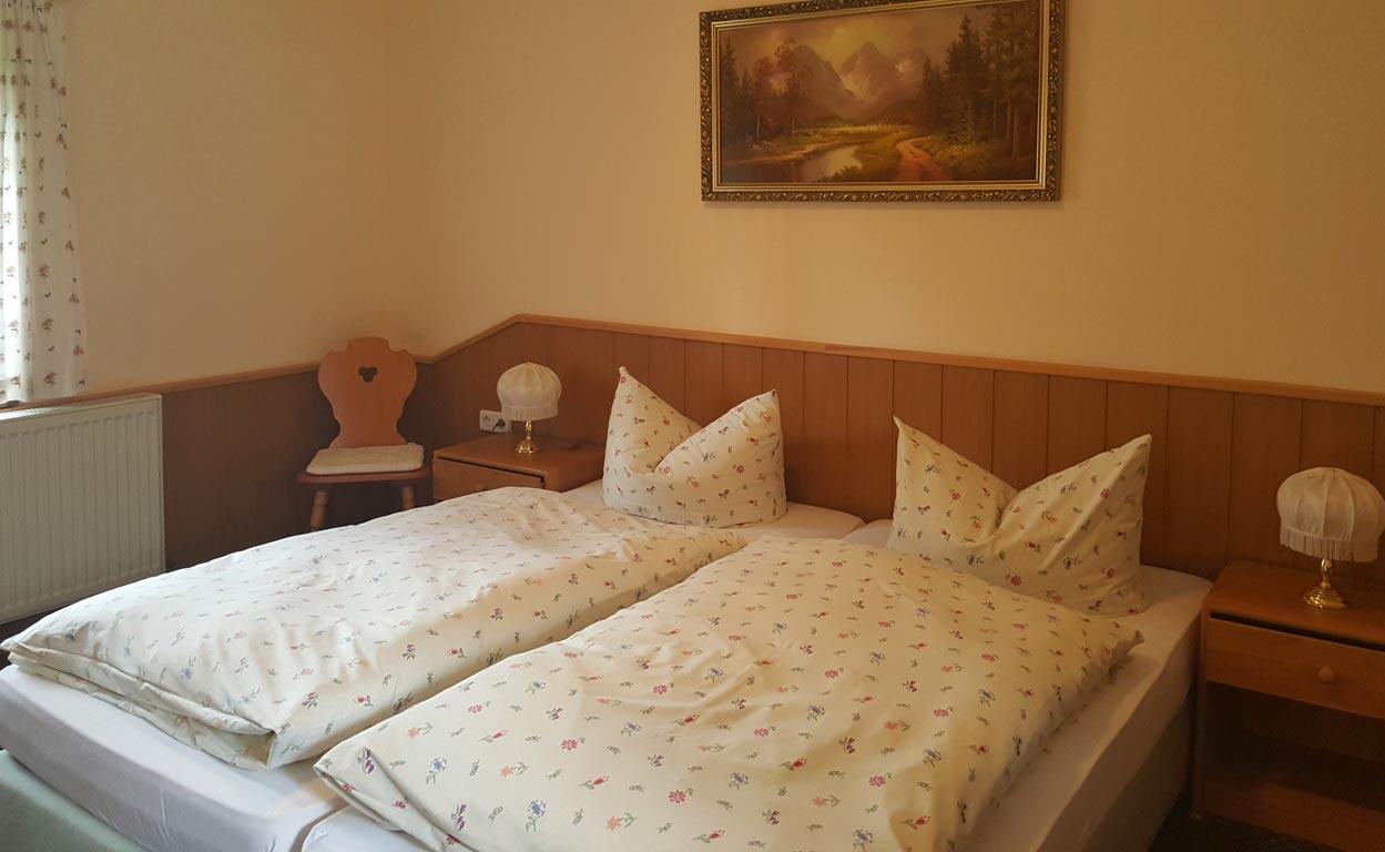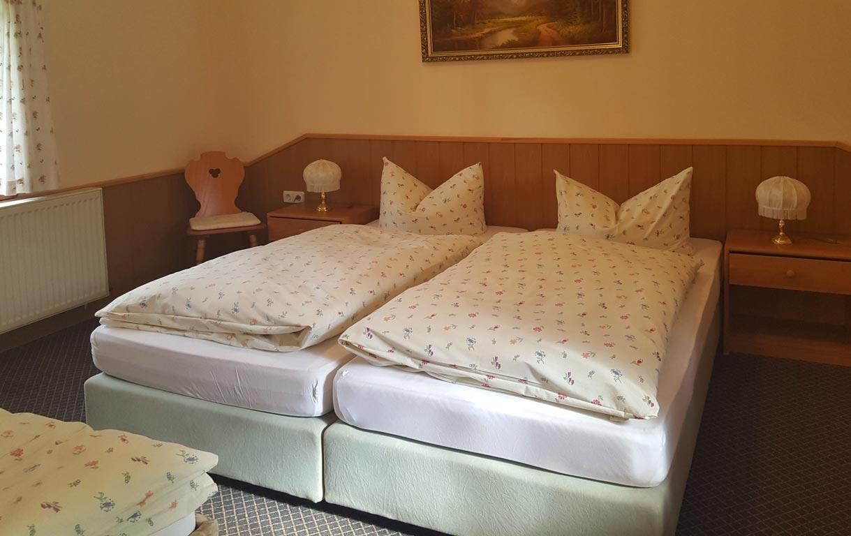 Die Pensionszimmer sind mit Dusche, WC, TV behaglich eingerichtet und die oberen Zimmer sind mit Balkonzugängen ausgestattet. Es stehen 10 Doppelzimmer, 4 Dreibettzimmer und 2 Vier-Bettzimmer zur Verfügung.