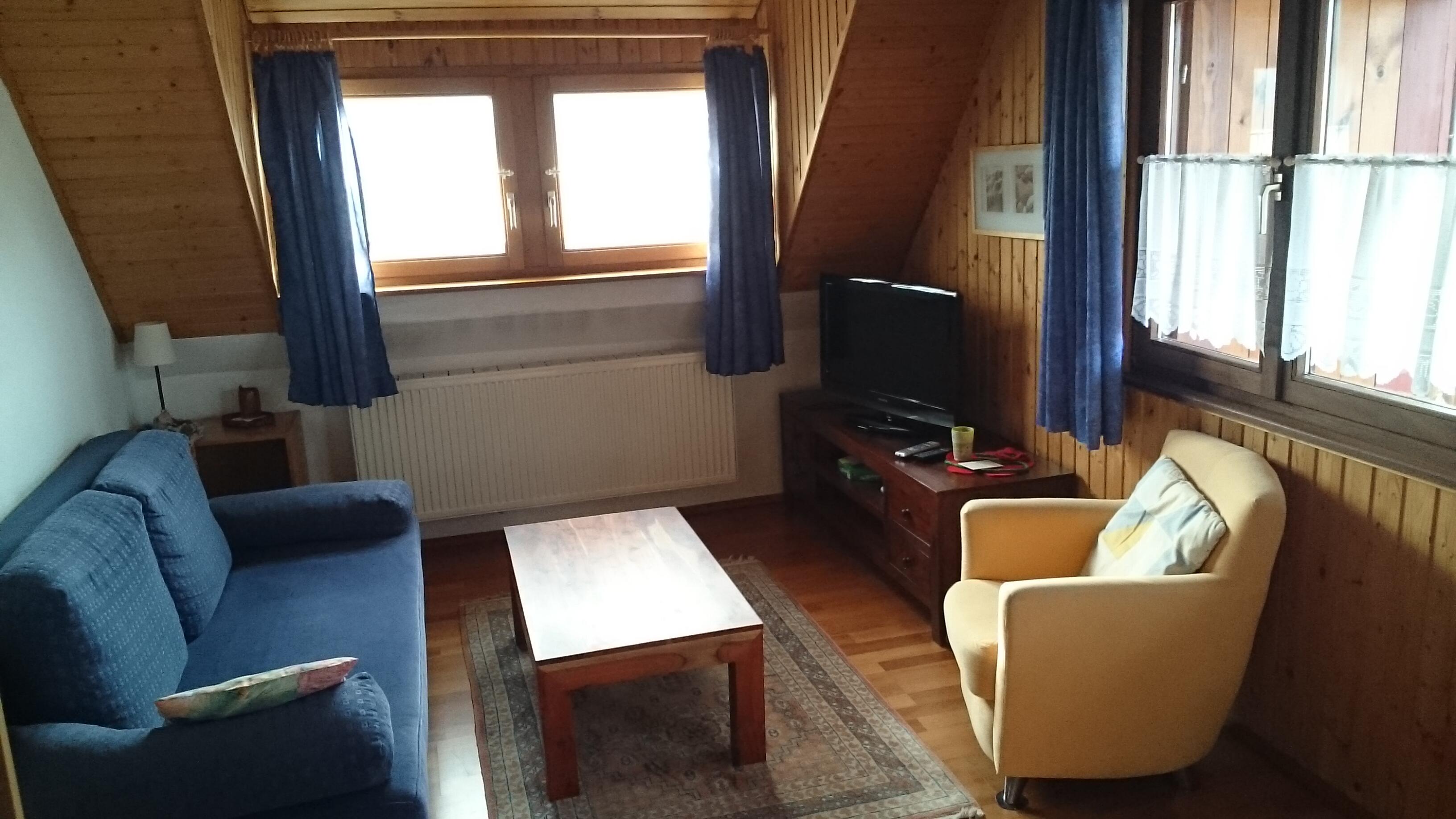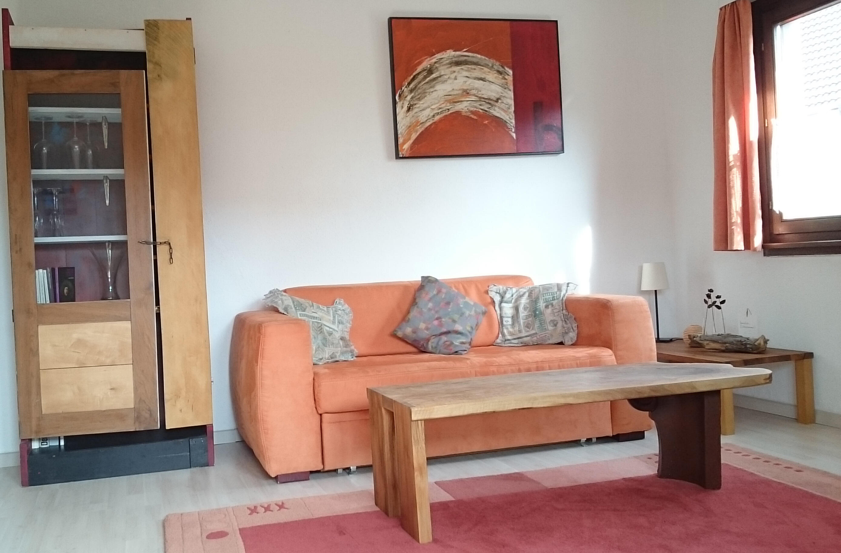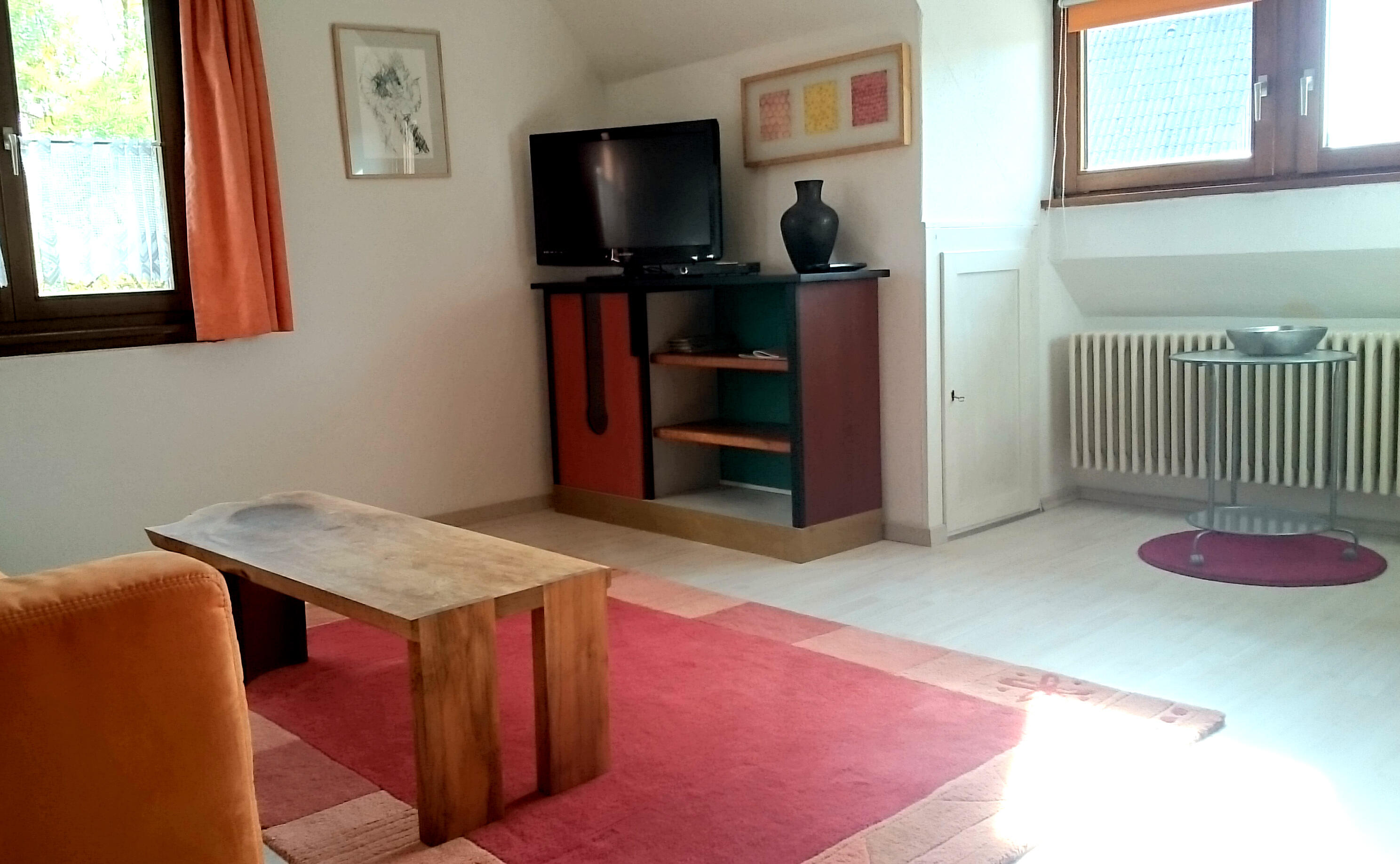 Eine einfach urgemütliche Studiowohnung ist diese 28qm feine Wohnung im Obergeschoss des Hauses. Das Doppelbett ist hier leicht in die Schrankwand versenkbar, so dass ein luftiges Appartement mit einem grossen, überdachten Westbalkon entsteht. Bei Bedarf ist die Couch zu einem dritten Schlafplatz erweiterbar- bedenken Sie hierbei aber die Grösse der Wohnung.