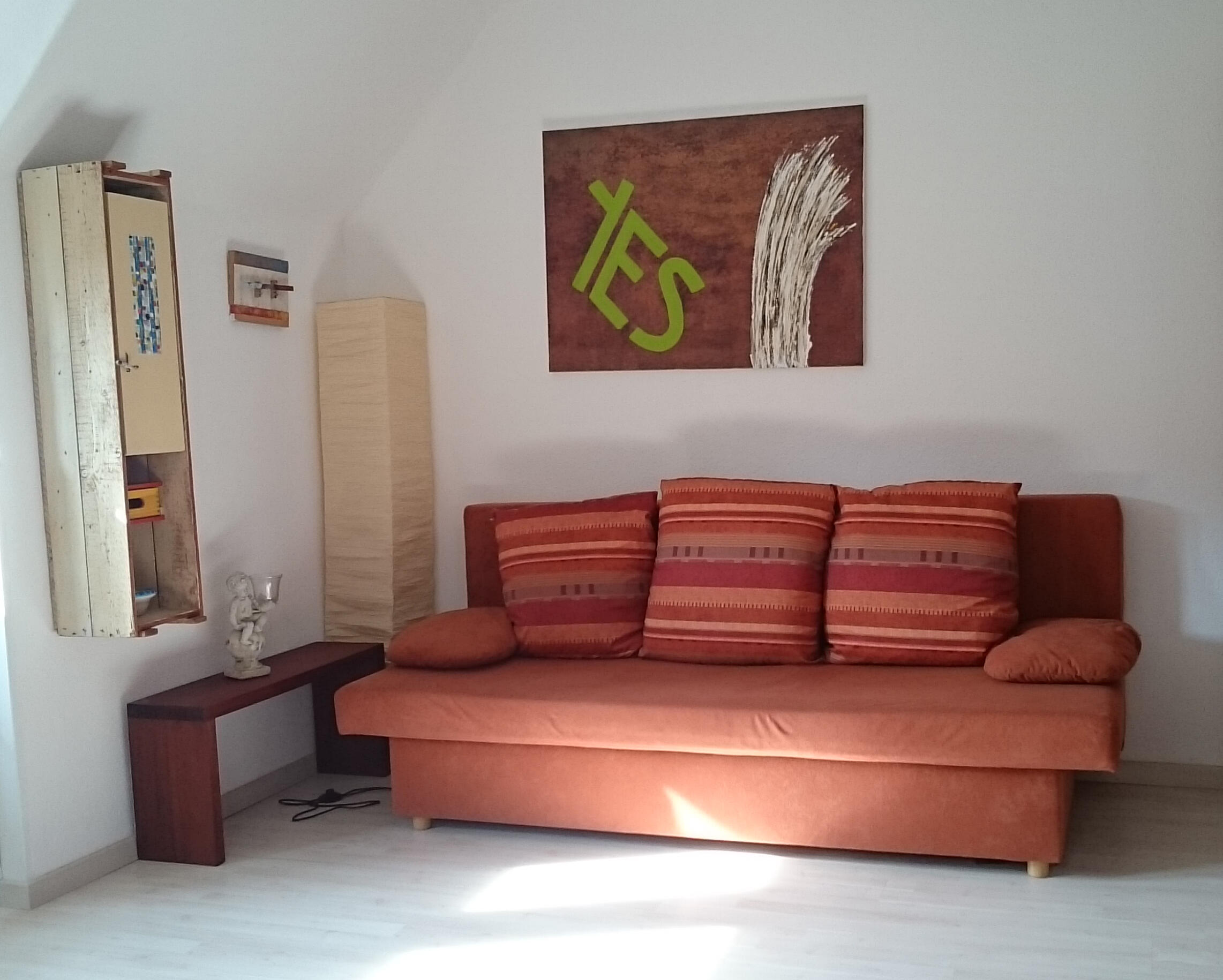 Ergänzend lässt sich die Couch im Wohnzimmer zu einem weiteren Schlafplatz ausziehen.