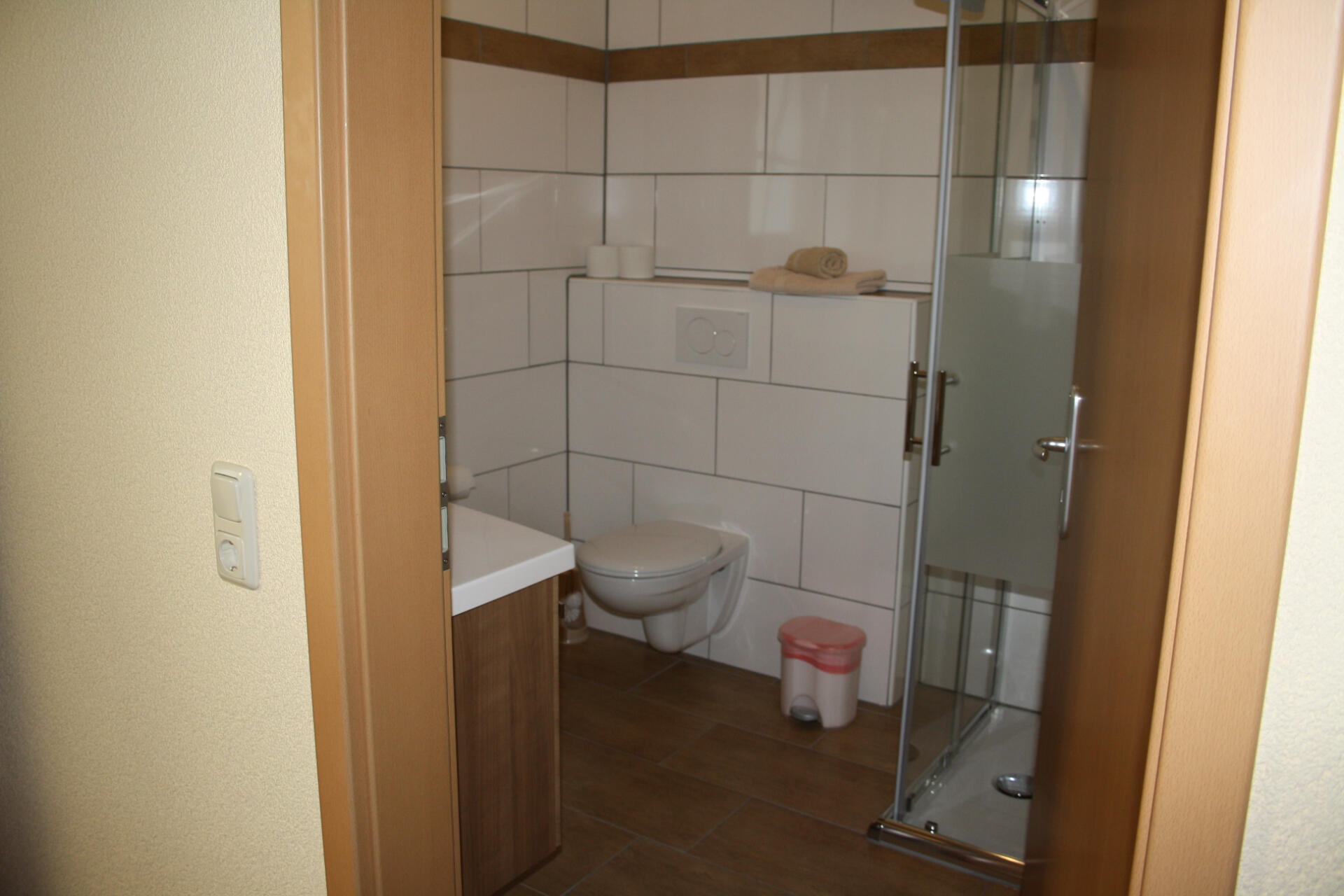 Das Bad ist ausgestattet mit einem Waschtisch, Toilette und einer 90x90 Dusche