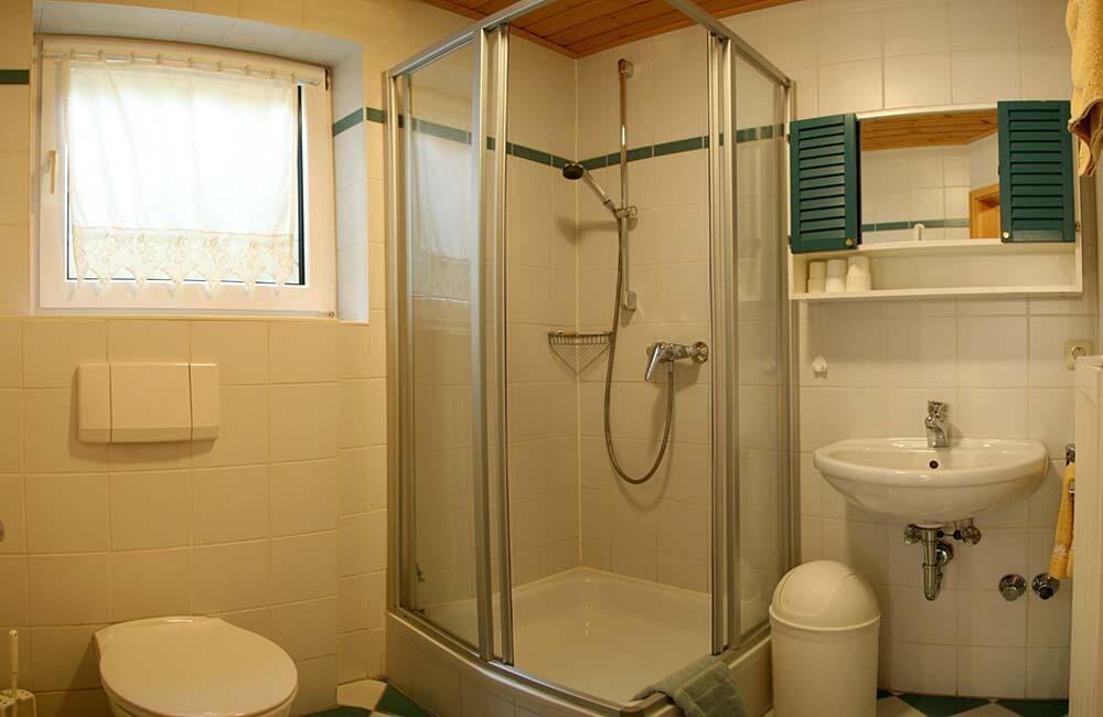 Bayerischer WaldBadezimmer: Flachduschwanne mit Glastür, WC, Badmöbel mit Waschbecken, und großen Spiegel, Schminkspiegel, Fön und Handtuchwärmer