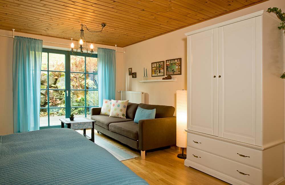Wohn-/Ess- und Schlafbereich: Flachbild-Digital-TV, Radio / CD Player, Radiowecker, WLAN-Empfang, große gemütliche Couch (kann als Einzel- oder Doppelbett ausgezogen werden), Doppelbett mit erstklassiger Komfortbettenausstattung und Matratzen (160x200), Essecke mit 4 Stühlen