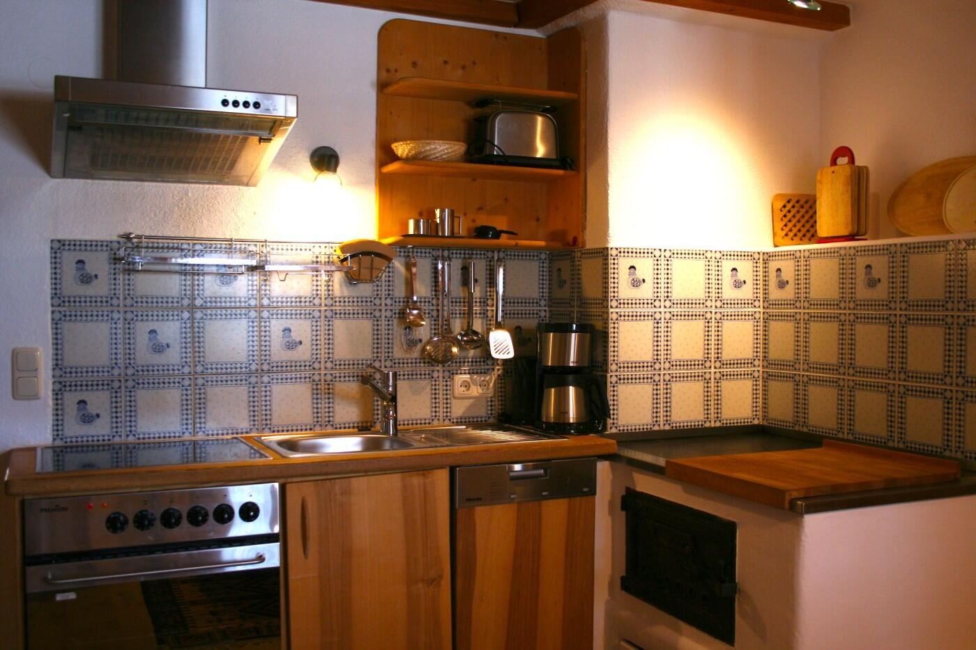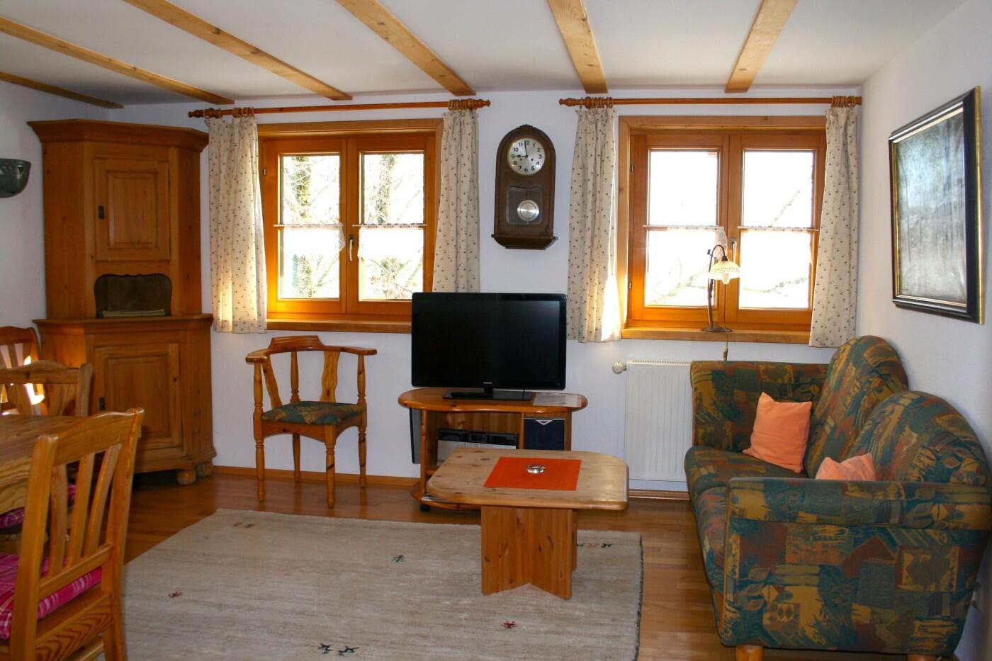 Gemütliche Ferienwohnung (ca. 85 qm) im 1. Stock Wohnraum "Wintergarten", Wohnküche mit Kachelofen, Bad, 2 Schlafzimmer mit je 2 Doppelbetten. Ein kleines zusätzliches Bett (1,60m Länge), Kinderbetten können zugestellt werden.