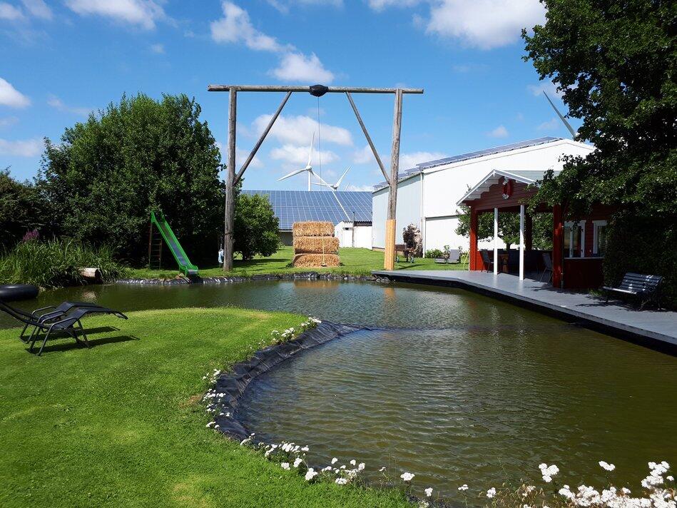 Zum Ferienhof gehört ein großer, vielfältig angelegter Garten, ein Spielplatz und außerdem ein toller Badeteich mit Tarzanschaukel.