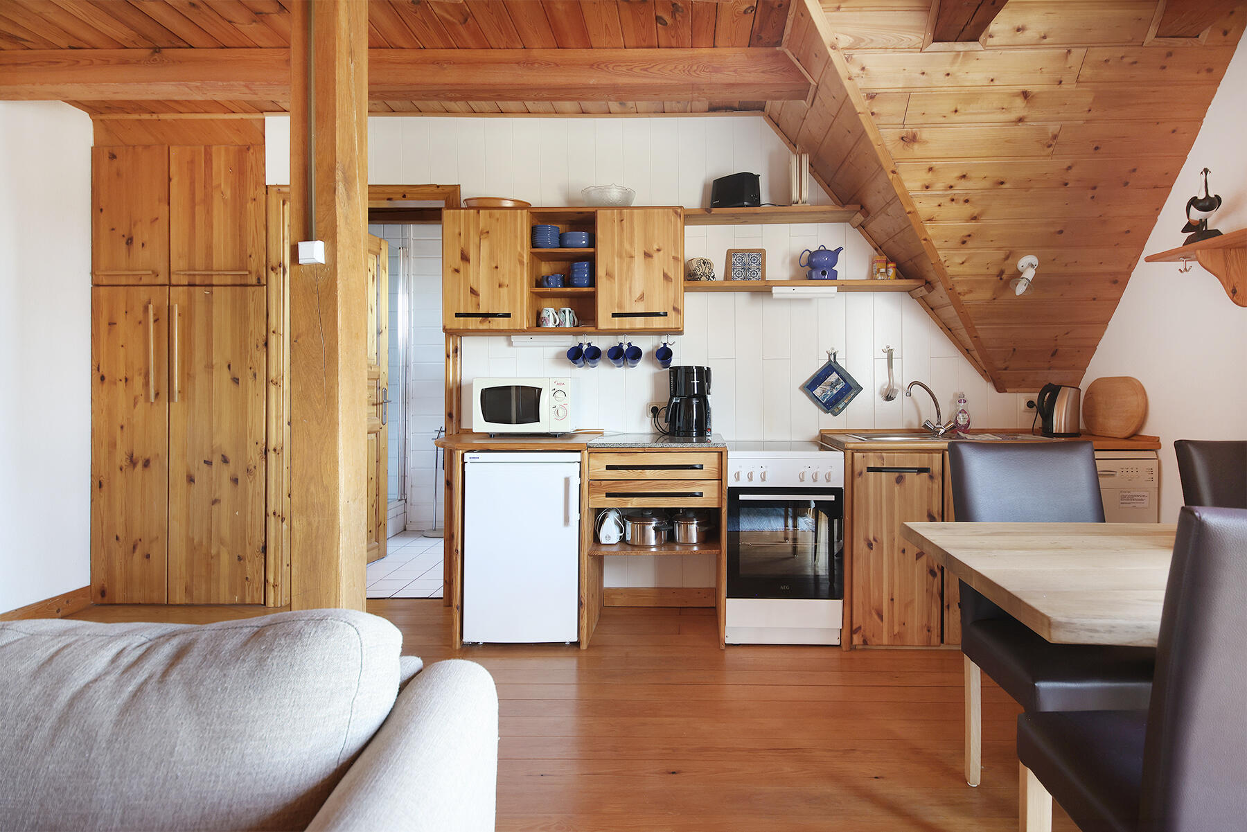 Die Wohnungen liegen alle im ersten Stock des Hofs. Ferienwohnung "Hein" ist für bis zu 5 Personen geeignet. Sie ist ca. 75 m² groß und zweigeschossig. Im unteren Geschoss befinden sich der Wohn- und Essraum, das Bad und das Schlafzimmer mit Doppelbett. Im oberen Geschoss ist ein Schlafzimmer mit vier Einzelbetten.