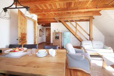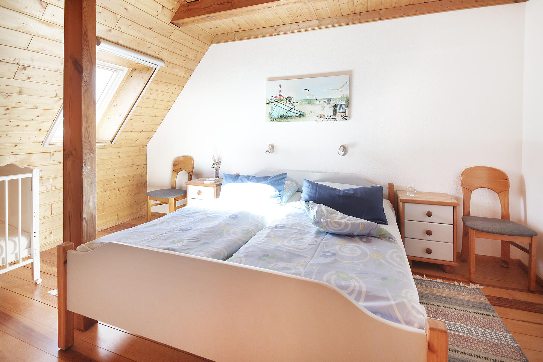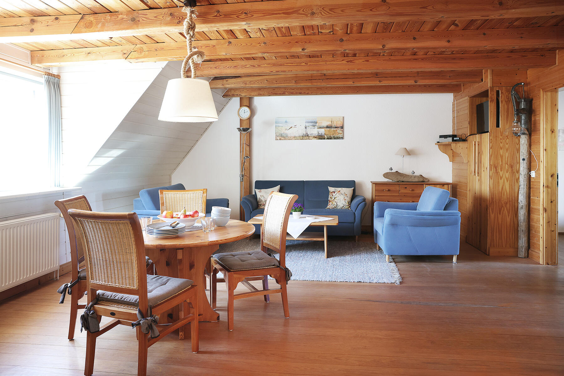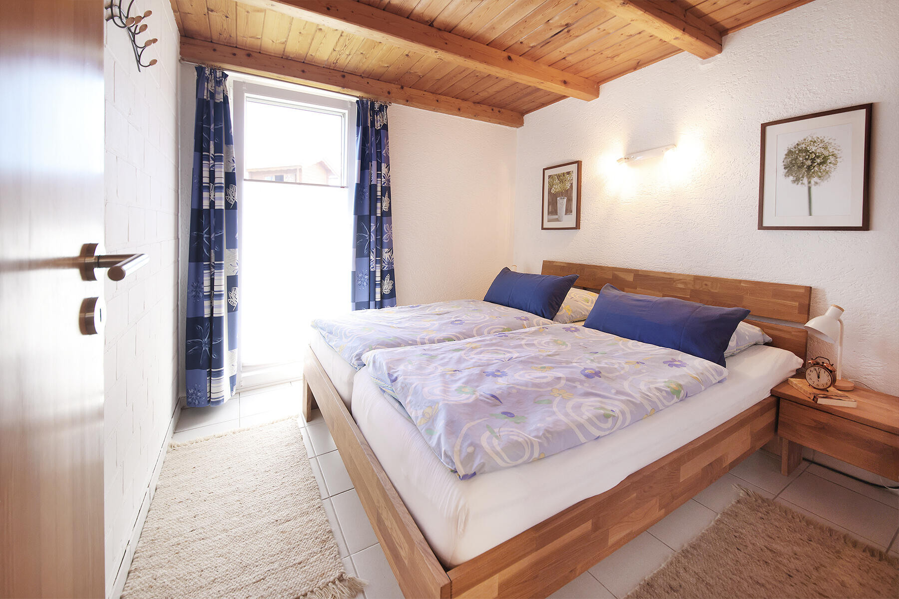 Die Wohnungen liegen alle im ersten Stock des Hofs. Ferienwohnung "Klaas" ist für bis zu 4 Personen geeignet. Sie ist ca. 62 m² groß und zweigeschossig. Im unteren Geschoss befinden sich der Wohn- und Essraum, das Bad und das Schlafzimmer mit zwei Einzelbetten. Im oberen Geschoss ist ein Schlafzimmer mit Doppelbett.