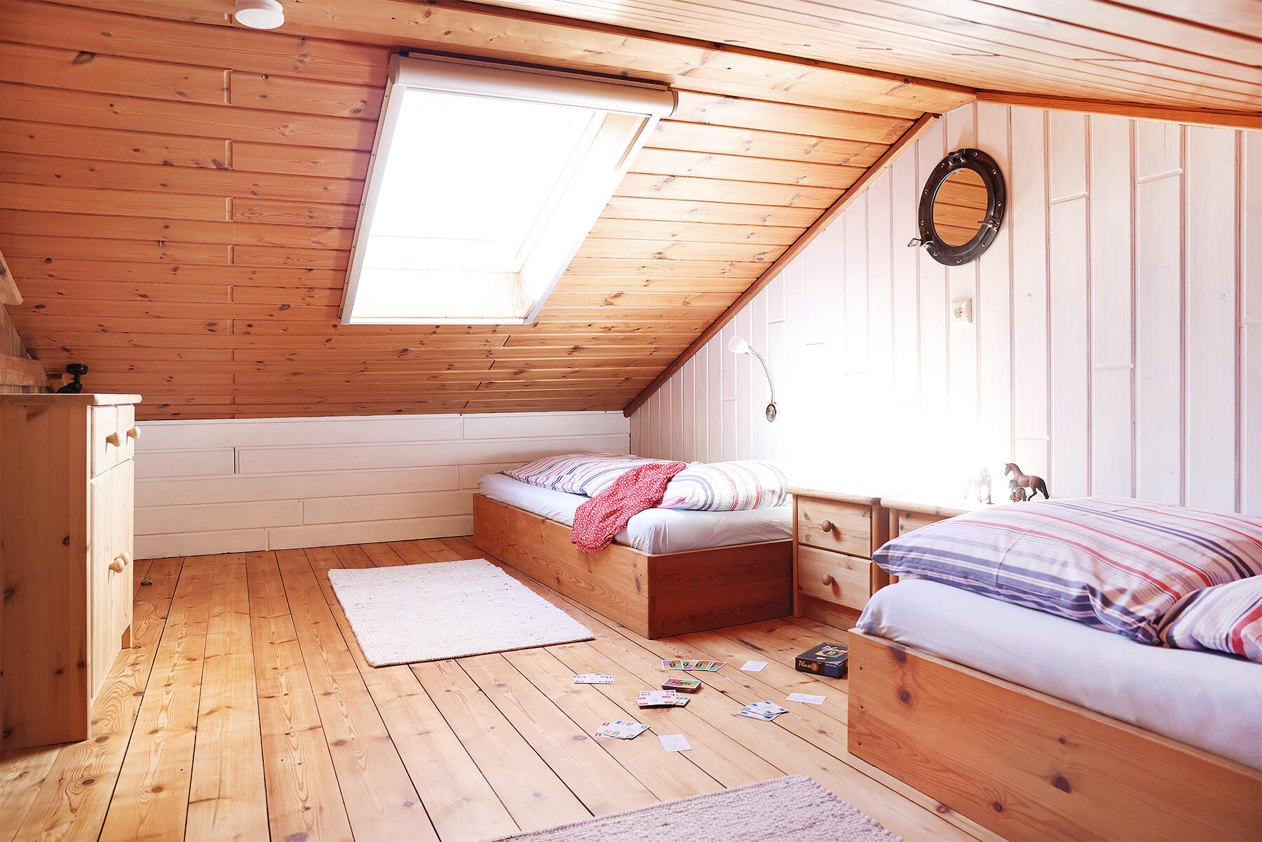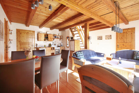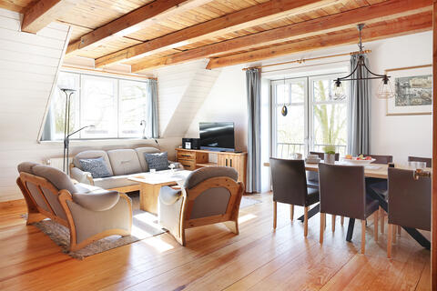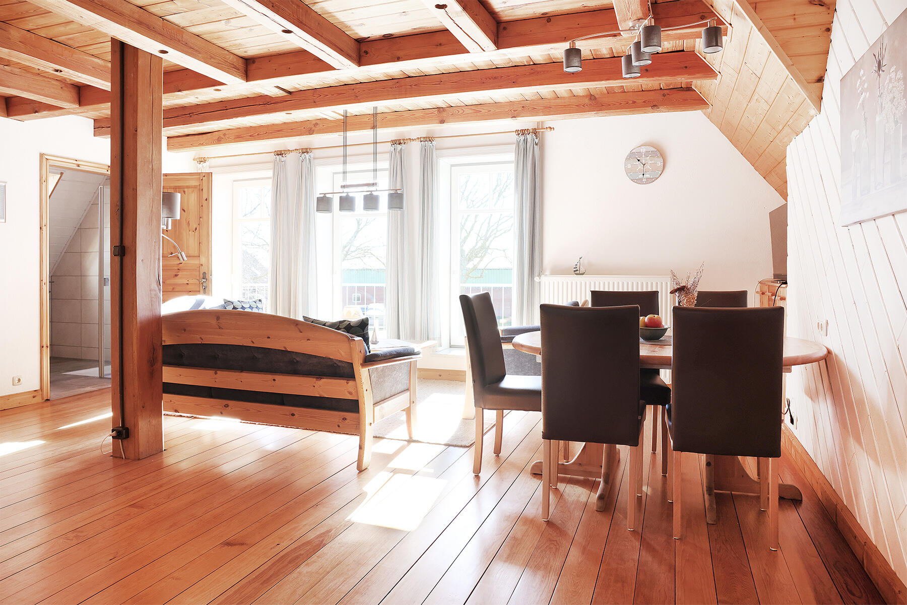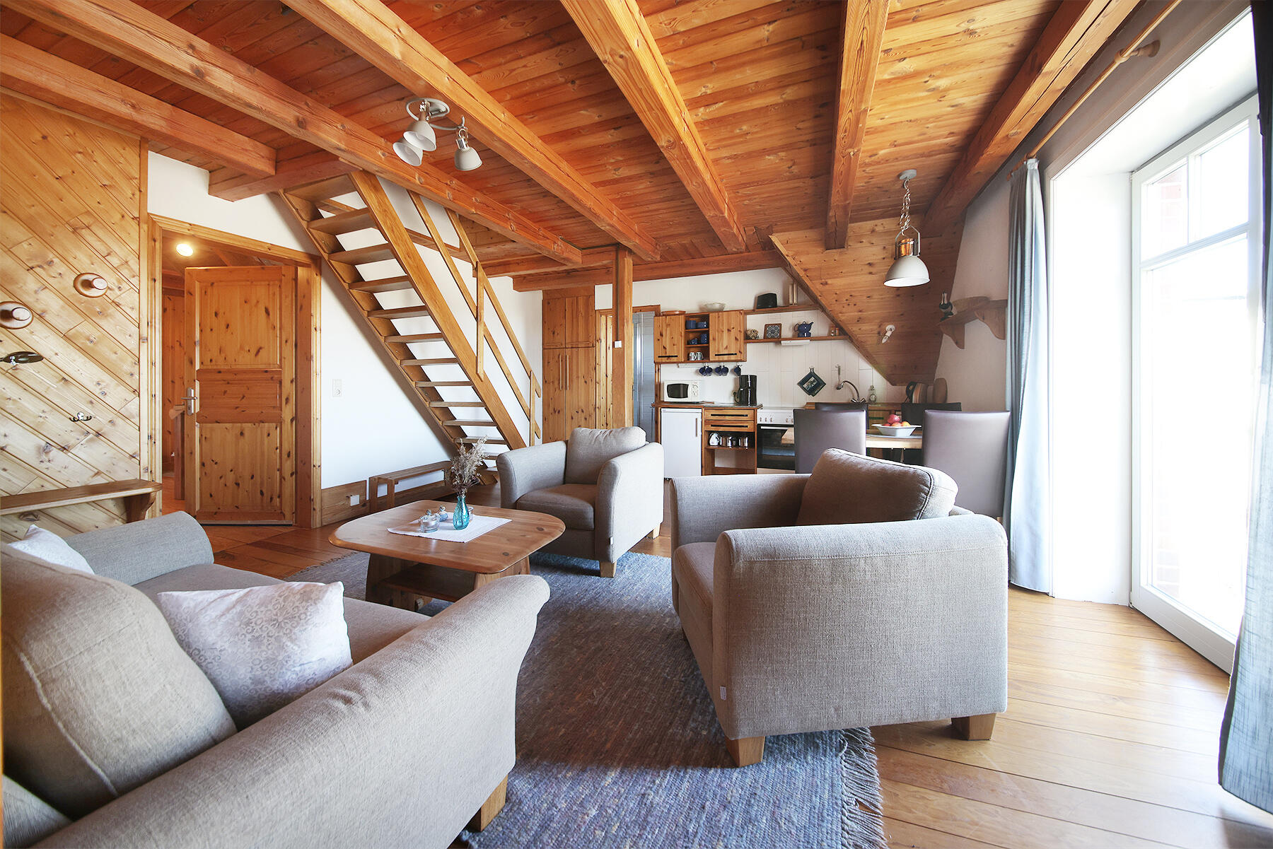 Die Wohnungen liegen alle im ersten Stock des Hofs. Ferienwohnung "Jan" ist für bis zu 6 Personen geeignet. Sie ist ca. 75 m² groß und zweigeschossig. Im unteren Geschoss befinden sich der Wohn- und Essraum, das Bad und das Schlafzimmer mit Doppelbett. Im oberen Geschoss ist ein Schlafzimmer mit vier Einzelbetten.