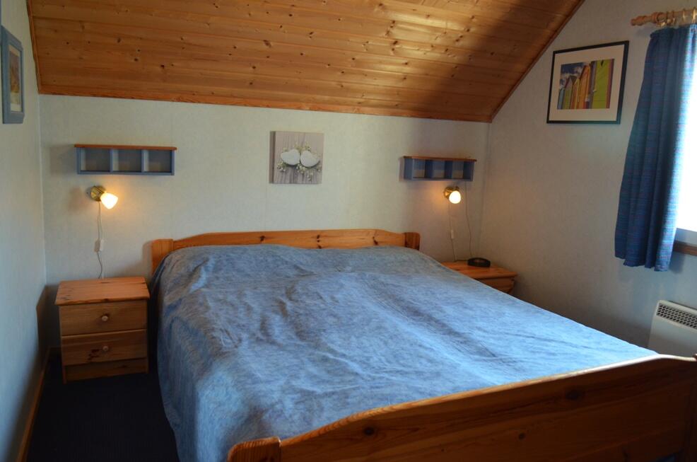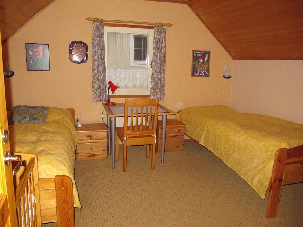Im größeren Schafzimmer im Obergeschoss stehen zwei getrennte Betten und auch ein kleiner Schreibtisch, sowie ein stabiles Babybett. Hier ist auch bei schlechtem Wetter genügend Spielfläche für Kinder. Wenn Sie mit zwei Kleinkindern kommen, steht zuätzlich ein Kinderreisebett zur Verfügung. In Haus 12 steht im zweiten Schlafzimmer im Obergeschoss ein Doppelbett, in Haus 13 stehen dort ebenfalls zwei Einzelbetten.