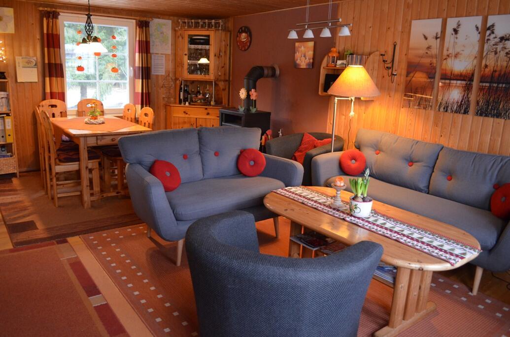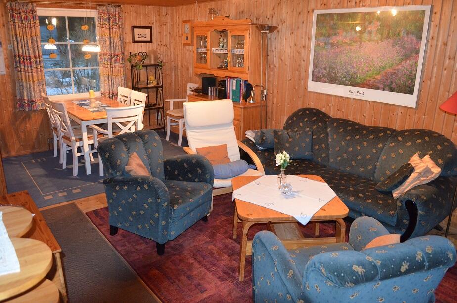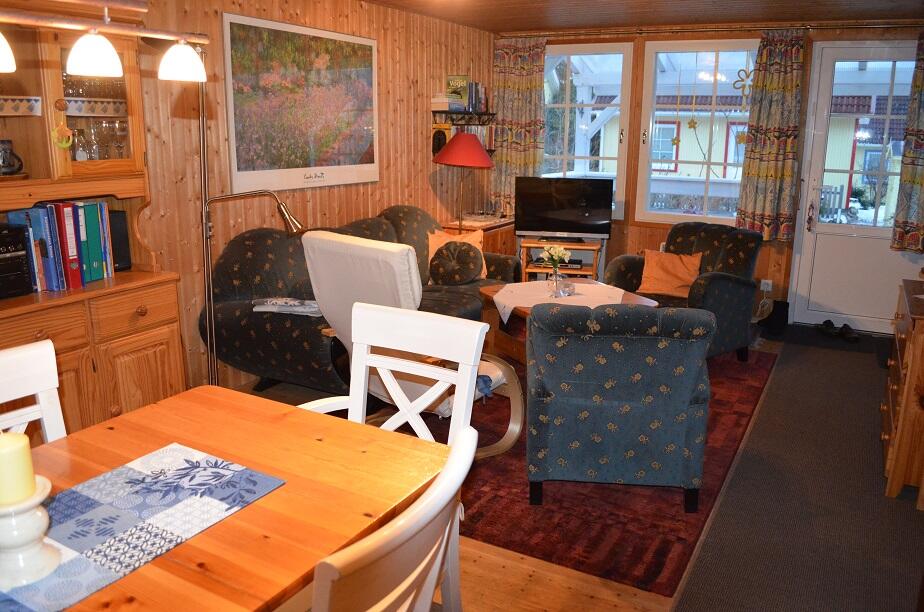 Das Wohnzimmer hat eine gemütliche Sitzgruppe und einen Essplatz. Ein Kaminofen sorgt in Haus 12 bei Bedarf für wohlige Wärme. Natürlich kann das Haus wie auch Haus 13 auch elektrisch beheizt werden. Ein Fernseher mit Satelliten-Antenne, Radio, CD- und DVD-Player sowie einige Gesellschaftsspiele bieten Unterhaltung bei jeder Witterung. Mappen mit Informationen zu Ausflugszielen und weiteres wissenswertes steht im Haus zur Verfügung. Auch Bücher, Spiele, einige Cassetten sowie CDs und DVDs für jede Altersgruppe liegen im Haus bereit.