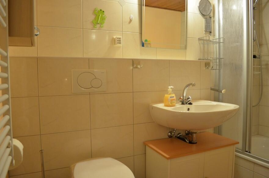 Das geflieste Bad ist ausgestattet mit Waschbecken, Dusche, WC, Waschmaschine und einer Wandheizung zum Trocknen von Handtüchern.